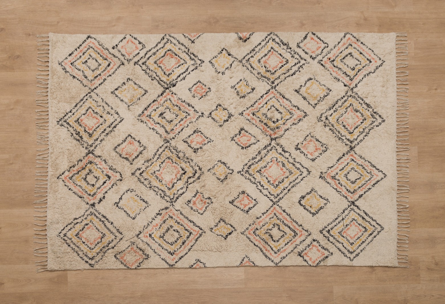 ALFOMBRA CON DIBUJOS EN COLORES CÁLIDOS SOBRE FONDO COLOR ARENA REALIZADA A MANO Y CON DETALLE DE FLECOS. TEJIDO 100% ALGODÓN. PARTE INFERIOR REFORZADA.LIMPIEZA EN SECO. ASPIRADORA A MINIMA POTENCIA.