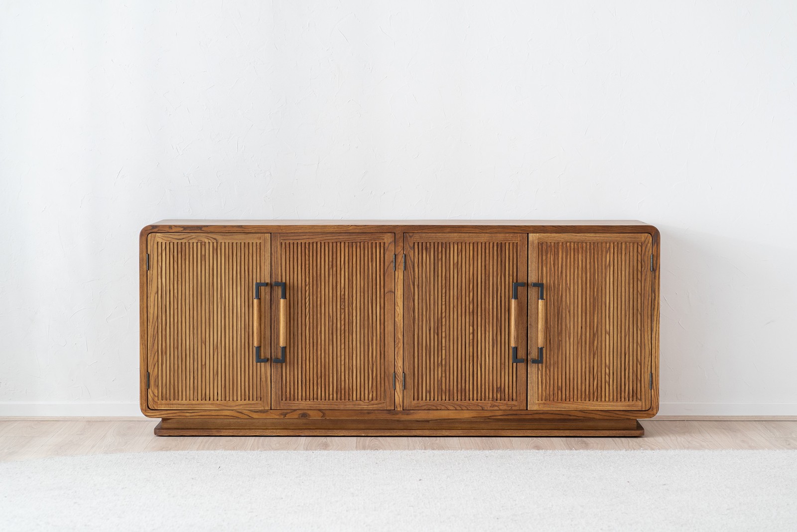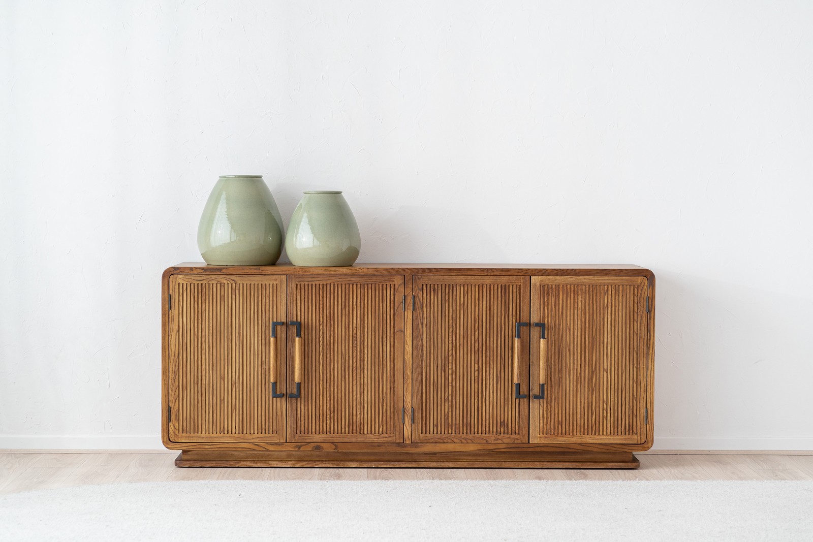 APARADOR HEREA. APARADOR REALIZADO EN TABLERO CONTRACHAPADO ACABADO EN FRESNO NATURAL CON PATA EN MADERA MACIZA. CUATRO PUERTAS Y BALDAS INTERIORES. EL APARADOR HEREA ES UNA PIEZA DE LÍNEAS SUAVES Y CANTOS REDONDEADOS CON PUERTAS ACANALADAS QUE SE COMPLEMENTAN CON TIRADORES METÁLICOS EN NEGRO MATE A LOS QUE APORTA CALIDEZ LA PIEZA EN MADERA DE FRESNO QUE INCORPORAN. SU ACABADO EN TONO MIEL CON LA VETA LIGERAMENTE MÁS OSCURA CONVIERTEN ESTAN PIEZA EN LA OPCIÓN PERFECTA PARA CREAR ESPACIOS ACOGEDORES SIN PERDER DE VISTA EL DISEÑO.