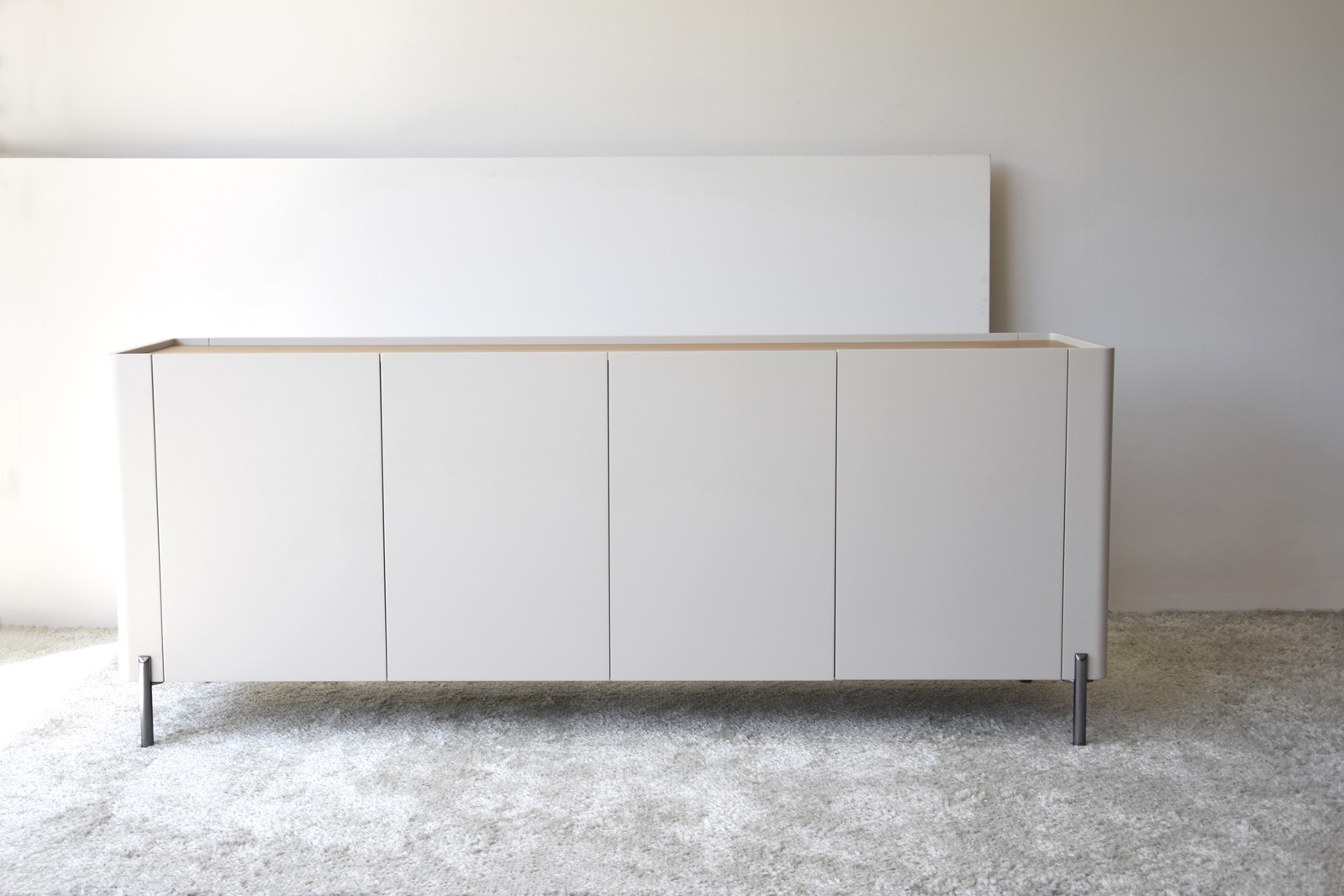 APARADOR REALIZADO EN DM LACADO EN TONO GRIS ARENA CON ACABADO MATE Y PARTE SUPERIOR RECHAPADO EN MADERA DE ROBLE NATURAL. PIEZA DE MOBILIARIO DE LINEAS SUAVES Y SINUOSAS CON BORDES REDONDEADOS Y DISEÑO ATEMPORAL CAPAZ DE TENER UN PAPEL PROTAGONISTA EN LOS INTERIORES DESDE LA COCINA HASTA LA SALA DE ESTAR LA ENTRADA Y LA ZONA DE NOCHE. LA COMBINACION DEL LACADO MATE CON LA MADERA DE ROBLE DA COMO RESULTADO UNA PIEZA DE MOBILIARIO CÁLIDO Y CONTEMPORÁNEO. LAS PATAS DE NIQUEL OSCURO ESTÁN INTEGRADAS EN EL DISEÑO APORTANDO UN GRADO DE SOFISTICACION AL MUEBLE. EL CUERPO PRINCIPAL ESTA FORMADO POR 4 PUERTAS Y BALDAS DE VIDRIO TEMPLADO TRANSPARENTE EN EL INTERIOR.