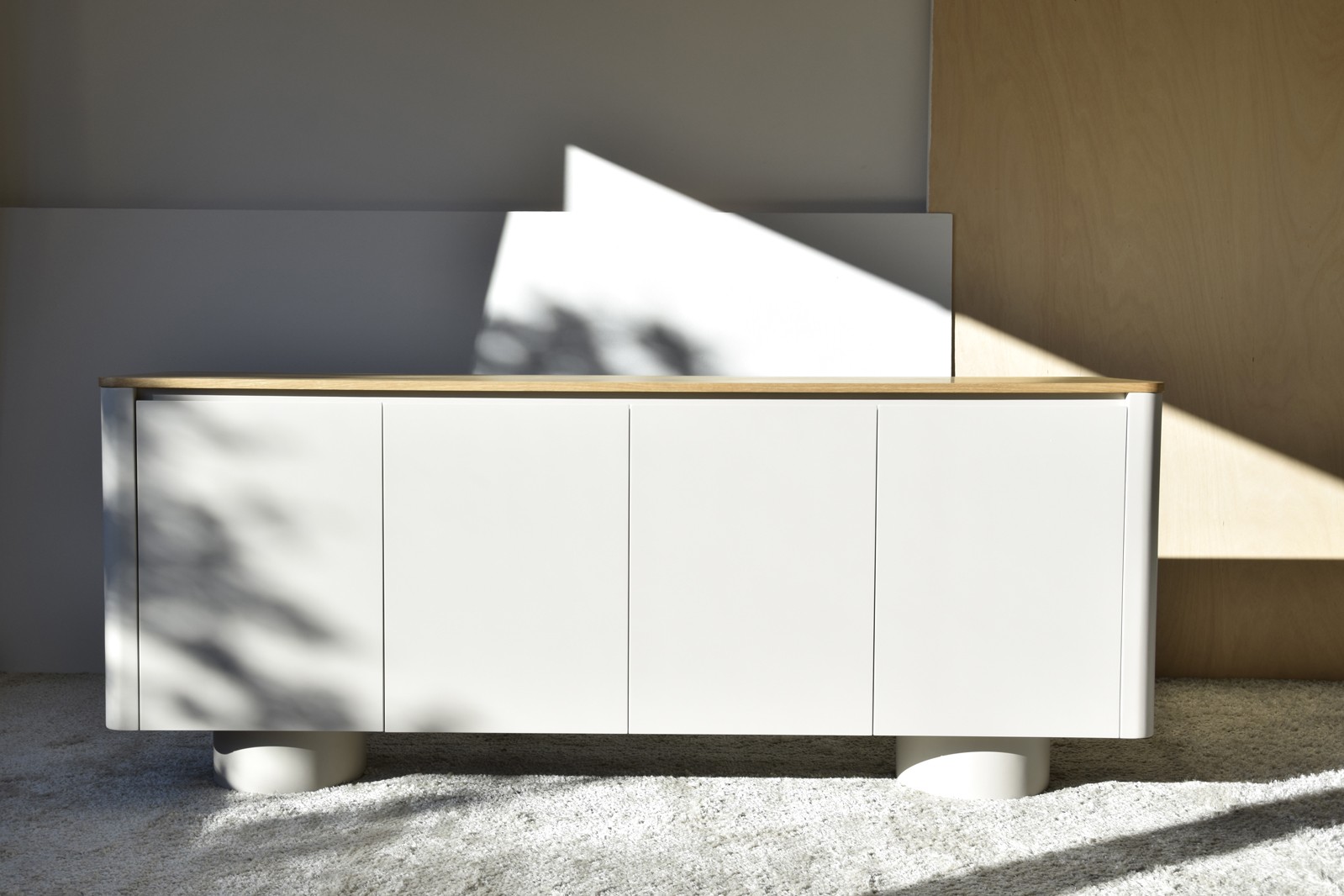 APARADOR REALIZADO EN DM LACADO EN TONO GRIS ARENA CON ACABADO MATE Y PARTE SUPERIOR RECHAPADA EN MADERA DE ROBLE NATURAL. PIEZA DE MOBILIARIO DE LINEAS SUAVES Y SINUOSAS CON BORDES REDONDEADOS Y DISEÑO ATEMPORAL EN EL QUE DESTACA LA ORIGINALIDAD DE SU BASE FORMADA POR DOS CILINDROS LACADOS A MODO DE PATAS. LA COMBINACION DEL LACADO MATE CON LA MADERA DE ROBLE APORTA CALIDEZ A ESTE PIEZA. EL CUERPO PRINCIPAL ESTÁ FORMADO POR 4 PUERTAS CON APERTURA SUAVE CON ESTANTE DE VIDRIO TEMPLADO EN EL INTERIOR