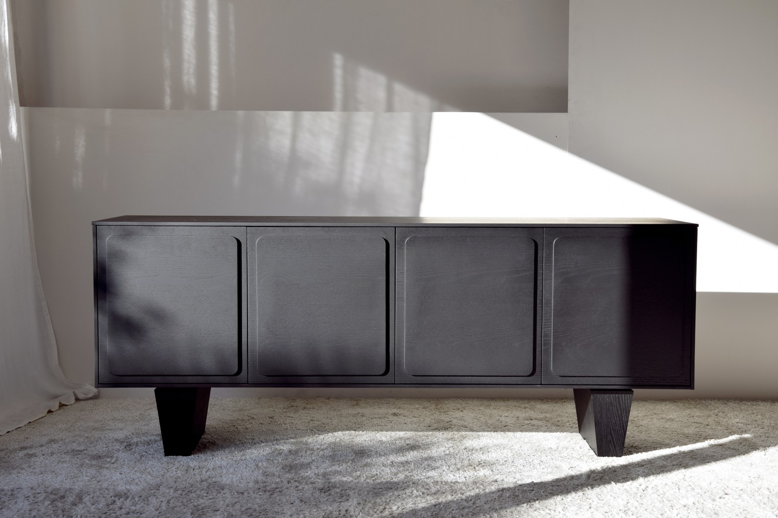 APARADOR RÍO. APARADOR REALIZADO EN DM RECHAPADO EN ROBLE NATURAL TEÑIDO EN COLOR NEGRO DE ACABADO MATE. CUENTA CON 4 PUERTAS CON SISTEMA PUSH DE APERTURA Y ESTANTES INTERIORES. LIMPIAR CON UN PAÑO SECO. NO UTILIZAR PRODUCTOS ABRASIVOS. REQUIERE MONTAJE