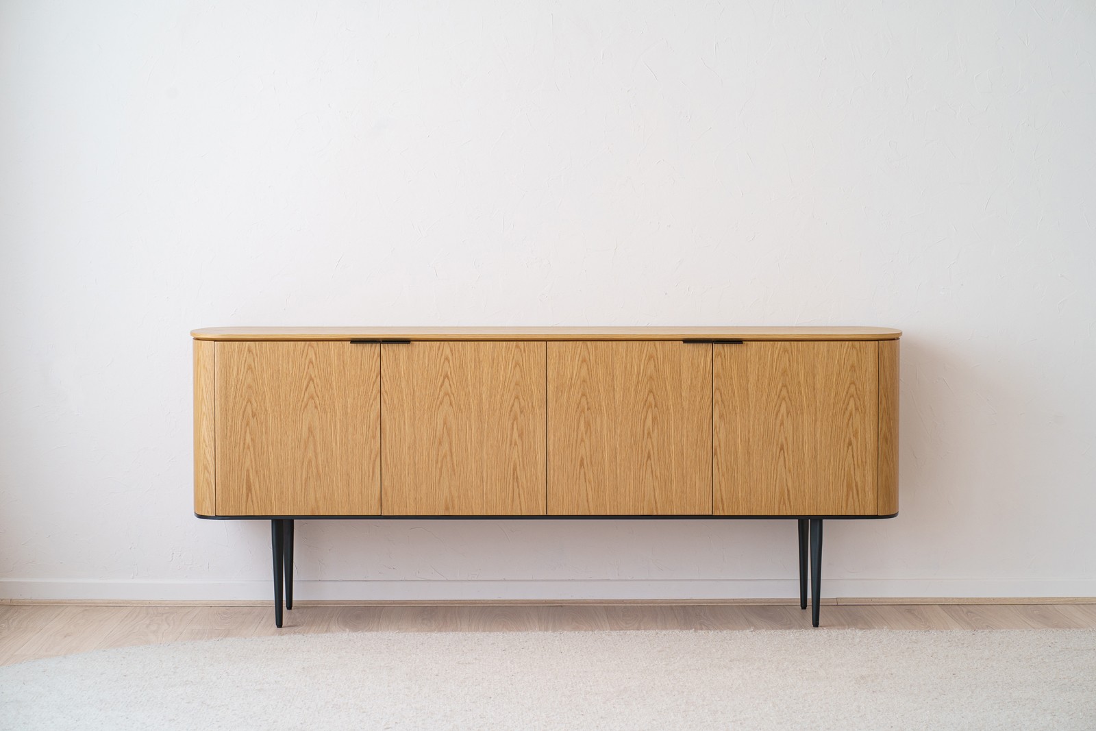 APARADOR REALIZADO EN TABLERO DM RECHAPADO EN MADERA DE ROBLECON ACABADO MATE Y NATURAL. LAS PATAS Y LOS TIRADORES EN FORMA DE PLETINA SON DE METAL COLOR NEGRO Y ACABADO MATE. DISPONE DE CUATRO PUERTAS. EL APARADOR NEO ES UNA PIEZA DE LÍNEAS REDONDEADAS Y APARIENCIA LIGERA PENSADO PARA ESPACIOS CONTEMPORÁNEOS EN LOS QUE SE BUSCA LA CALIDEZ DE LOS ACABADOS NATURALES CON UNA NOTA DE SOFISTICACIÓN Y DISEÑO PIEZAS ATEMPORALES QUE PERDUREN EN EL TIEMPO.