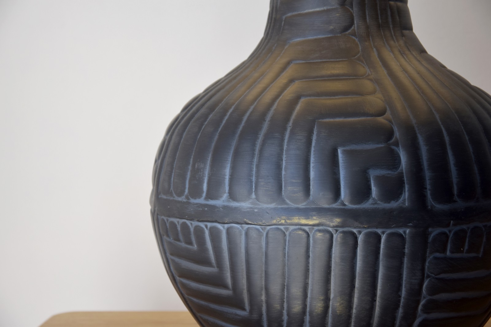 LÁMPARA DE MESA REALIZADA EN HIERRO Y ACABADO EN COLOR NEGRO Y DETALLES EN GRIS AZUL ANTIGUO. EL HIERRO ES TRABAJADO A MANO DE FORMA ARTESANAL PARA CONSEGUIR UNA SUPERFIE CON UNA TRAMA ÚNICA EN CADA PIEZA.LA PANTALLA CILÍNDRICA ESTÁ REALIZADA EN ALGODÓN BLANCO ROTO CON VIVO INFERIOR Y SUPERIOR EN NEGRO.MEDIDA PANTALLA:38XH38CM. MEDIDA BASE LAMP:34X38CM. CASQUILLO E27