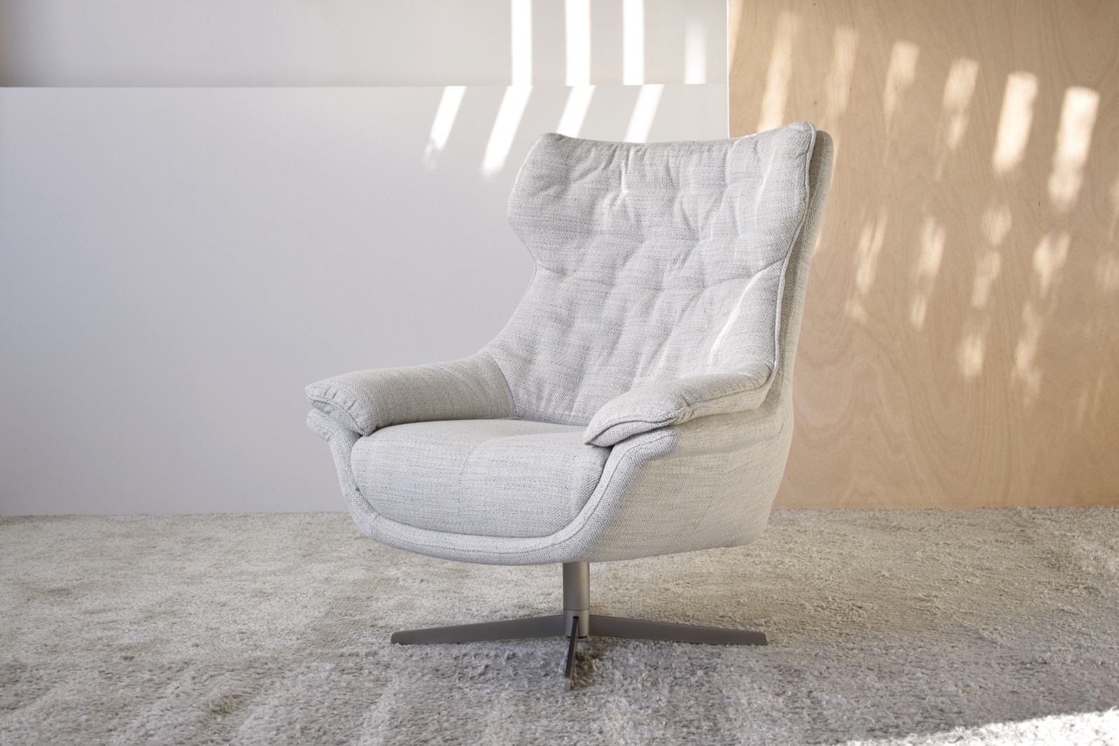 BUTACA GIRATORIA CON PIE EN ACERO TAPIZADA EN MEZCLILLA TONOS BEIGE. ESTA BUTACA DESTACA POR UN DISEÑO SENCILLO QUE INVITA AL DESCANSO GRACIAS A SUS FORMAS Y UNA ESTÉTICA MULLIDA DONDE LA SENSACIÓN DE RELAX ESTÁ ASEGURADA. EL TEJIDO EN TONOS BEIGE CON PINCELADAS SUTILES EN GRIS OSCURO COMBINA A LA PERFECCION CON LAS PATAS DE ACERO DE DISEÑO LIVIANO. EL DISEÑO DE LAS COSTURAS EN ESTA BUTACA HACE DESTACAR AÚN MÁS SU ESTETICA SENCILLA PERFECTAMENTE COMBINABLE EN CUALQUIER ESTANCIA. TELA N9-TEJIDO 85% POLIESTER 15% ACRÍLICO-PATAS REQUIEREN MONTAJE-SÓLO LIMEPIEZA PROFESIONAL