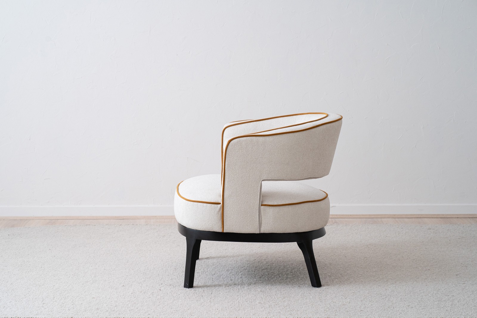 BUTACA DE ESTILO CONTEMPORÁNEO DE FORMA REDONDEADA TAPIZADA EN COLOR ARENA CLARO CON LIGERA TEXTURA TIPO BLOUCLÉ Y VIVOS EN COLOR MOSTAZA OSCURO. LA BASE ES EN MADERA MACIZA DE FRESNO EN COLOR NEGRO. SE TRATA DE UNA BUTACA CUYA TONALIDAD COMBINA A LA PERFECCIÓN CON MULTITUD DE GAMAS DE COLOR. SU CUIDADO Y TRANQUILO DISEÑO LE PERMITE DIALOGAR CON DIFERENTES ESTILOS DE DECORACIÓN. TELA S-ALTURA ASIENTO: 40CM.-TEJIDO INTERIOR:100% POLIESTER-TEJIDO EXTERIOR: 100% POLIESTER-NO ENCESITA MONTAJE-SÓLO LIMPIEZA PROFESIONAL.