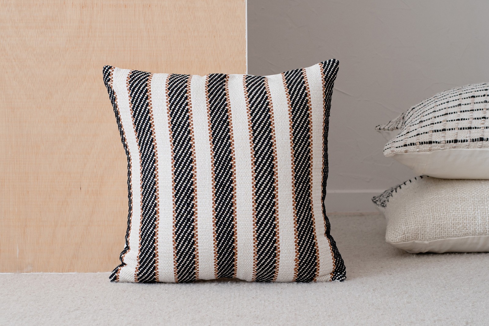 COJÍN COLECCIÓN OTO N.1. FUNDA CON DISEÑO DE FRANJAS EN BLANCO Y NEGRO CON UN TOQUE EN TERRACOTA QUE APORTA CALIDEZ A ESTE COJÍN. LA FUNDA ESTÁ REALIZADA EN ALGODÓN 100%. RELLENO DE FIBRA INCLUIDO. CIERRE CON CREMALLERA EN LA PARTE POSTERIOR. LIMPIEZA EN SECO