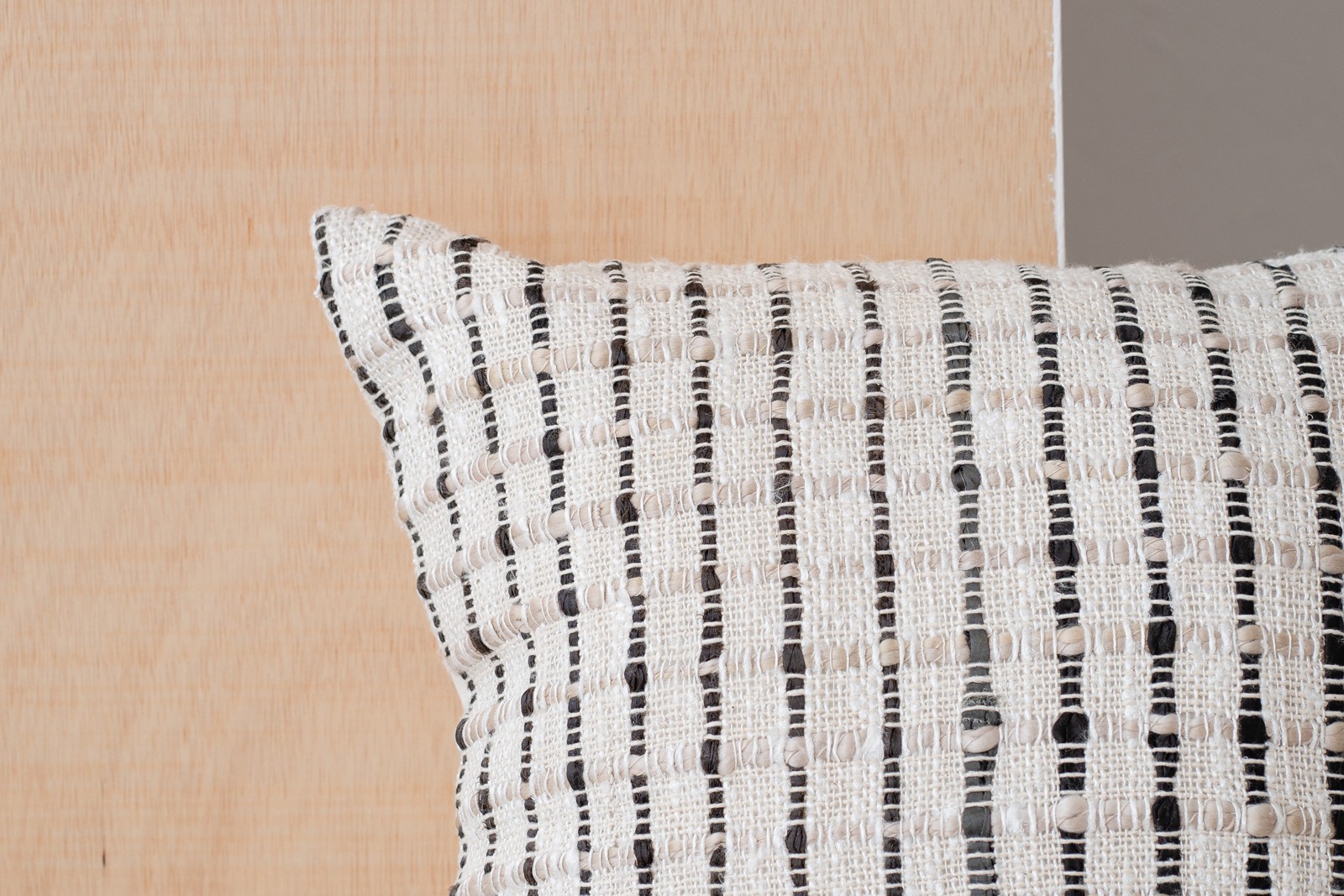 COJÍN COLECCIÓN OTO N.4. FUNDA CON DISEÑO DE LÍNEAS QUE COMBINA EL BLANCO Y EL NEGRO CON UN TONO BEIGE Y FORMA UN PATRÓN EN CUADRÍCULA. EL TEJIDO ES UN ENTRAMADO CON TEXTURA Y RELIEVE. LA FUNDA ESTÁ REALIZADA EN ALGODÓN 100%. RELLENO DE FIBRA INCLUIDO. CIERRE CON CREMALLERA EN LA PARTE POSTERIOR. LIMPIEZA EN SECO