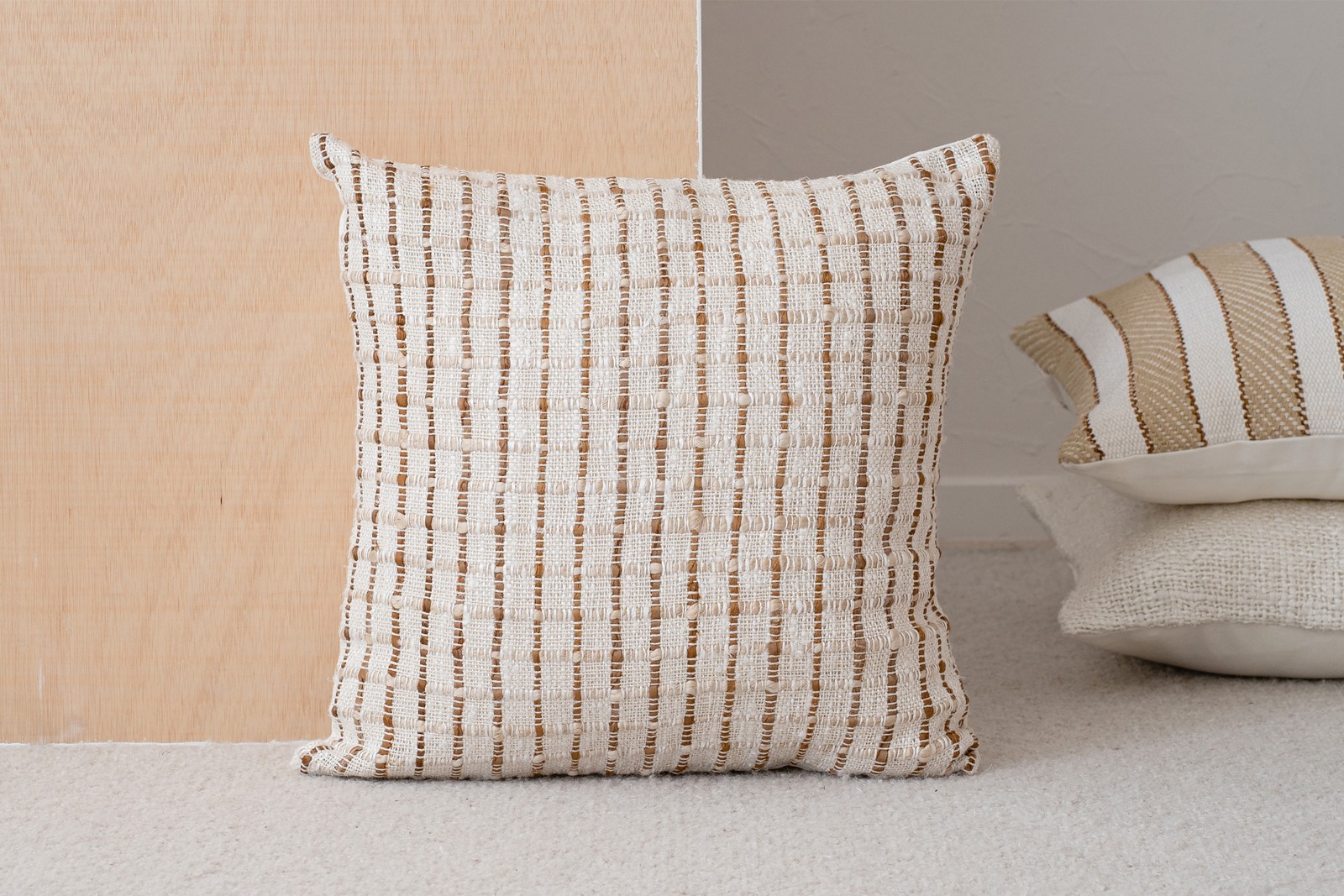 COJÍN COLECCIÓN ANXA N3. FUNDA CON DISEÑO DE LÍNEAS QUE COMBINA EL BLANCO Y EL BEIGE CON UN TONO MARRÓN FORMANDO UN PATRÓN EN CUADRÍCULA. EL TEJIDO ES UN ENTRAMADO CON TEXTURA Y RELIEVE. LA FUNDA ESTÁ REALIZADA EN ALGODÓN 100%. RELLENO DE FIBRA INCLUIDO. CIERRE CON CREMALLERA EN LA PARTE POSTERIOR. LIMPIEZA EN SECO
