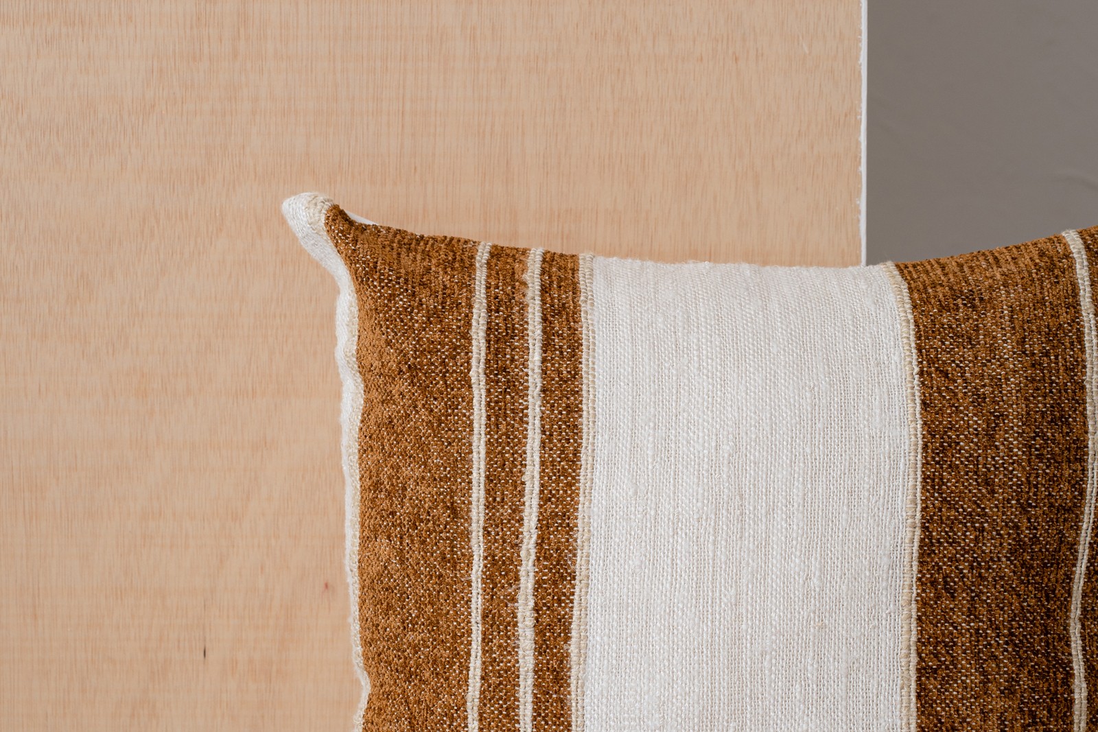 COJÍN COLECCIÓN MINIA N3. FUNDA REALIZADA EN UN TEJIDO CON TEXTURA QUE COMBINA FRANJAS EN UN TONO OCRE SOBRE LAS QUE SE DIBUJAN UNAS LÍNEAS EN BEIGE CON FRANJAS EN UN TONO BLANCO ROTO CREANDO UN DISEÑO LUMINOSO Y CÁLIDO. LA FUNDA ESTÁ REALIZADA EN ALGODÓN 100%. RELLENO DE FIBRA INCLUIDO. CIERRE CON CREMALLERA EN LA PARTE POSTERIOR. LIMPIEZA EN SECO
