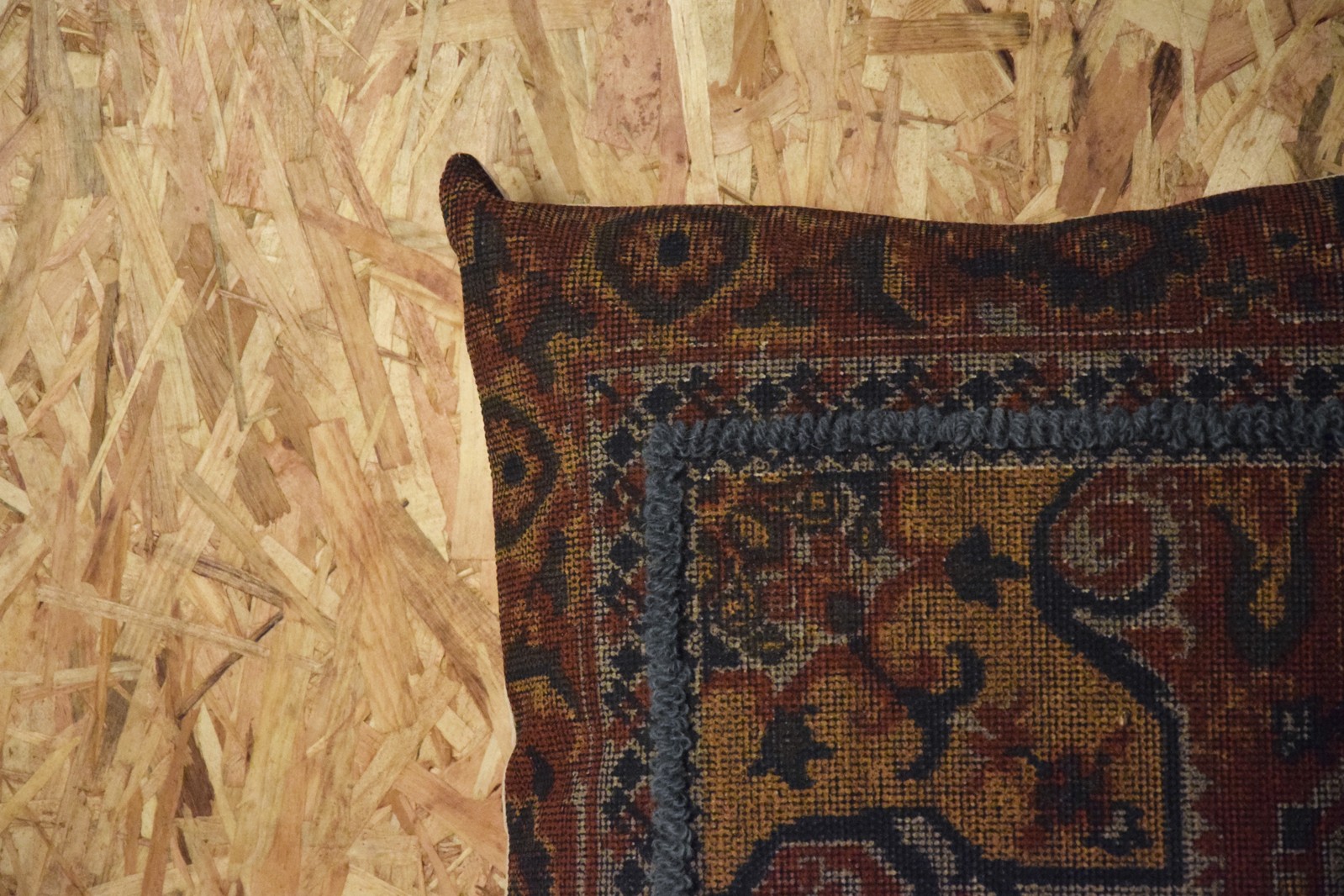COJIN ALGODON- LANA. OCRE Y BORDADO AZUL