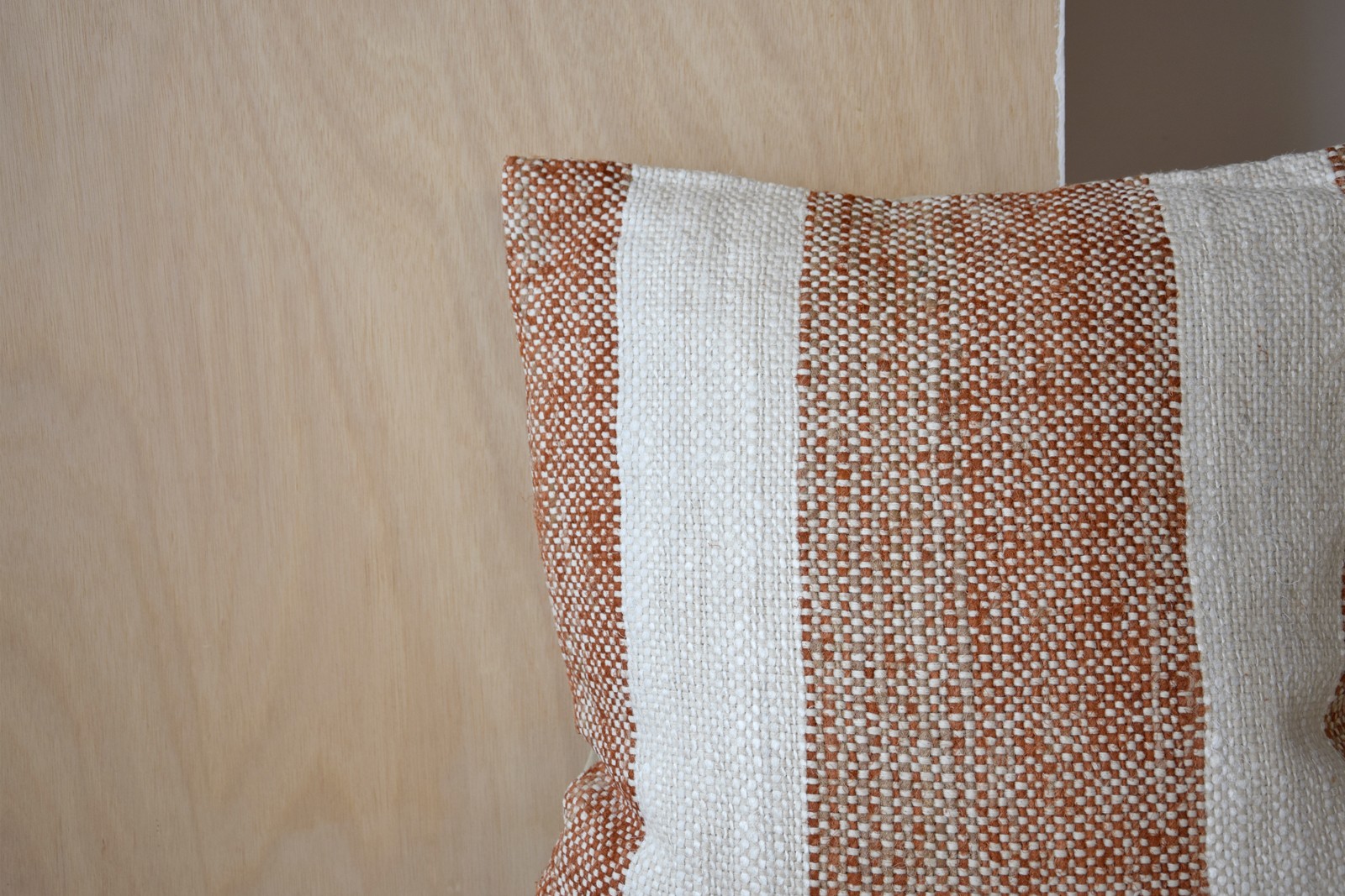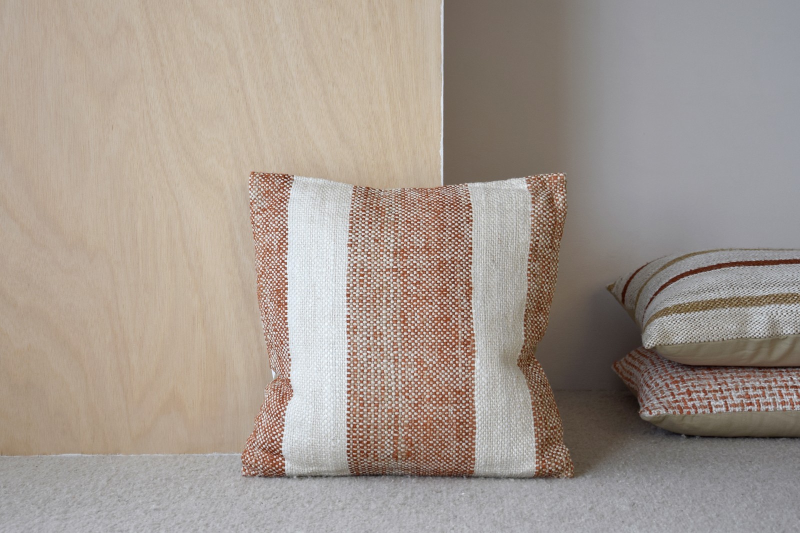 COJÍN COLECCIÓN OIA N.2. FUNDA CON DISEÑO DE FRANJAS EN TONOS NARANJAS Y BLANCO REALIZADA EN ALGODÓN 100%. RELLENO DE FIBRA INCLUIDO. CIERRE CON CREMALLERA EN LA PARTE POSTERIOR. LIMPIEZA EN SECO