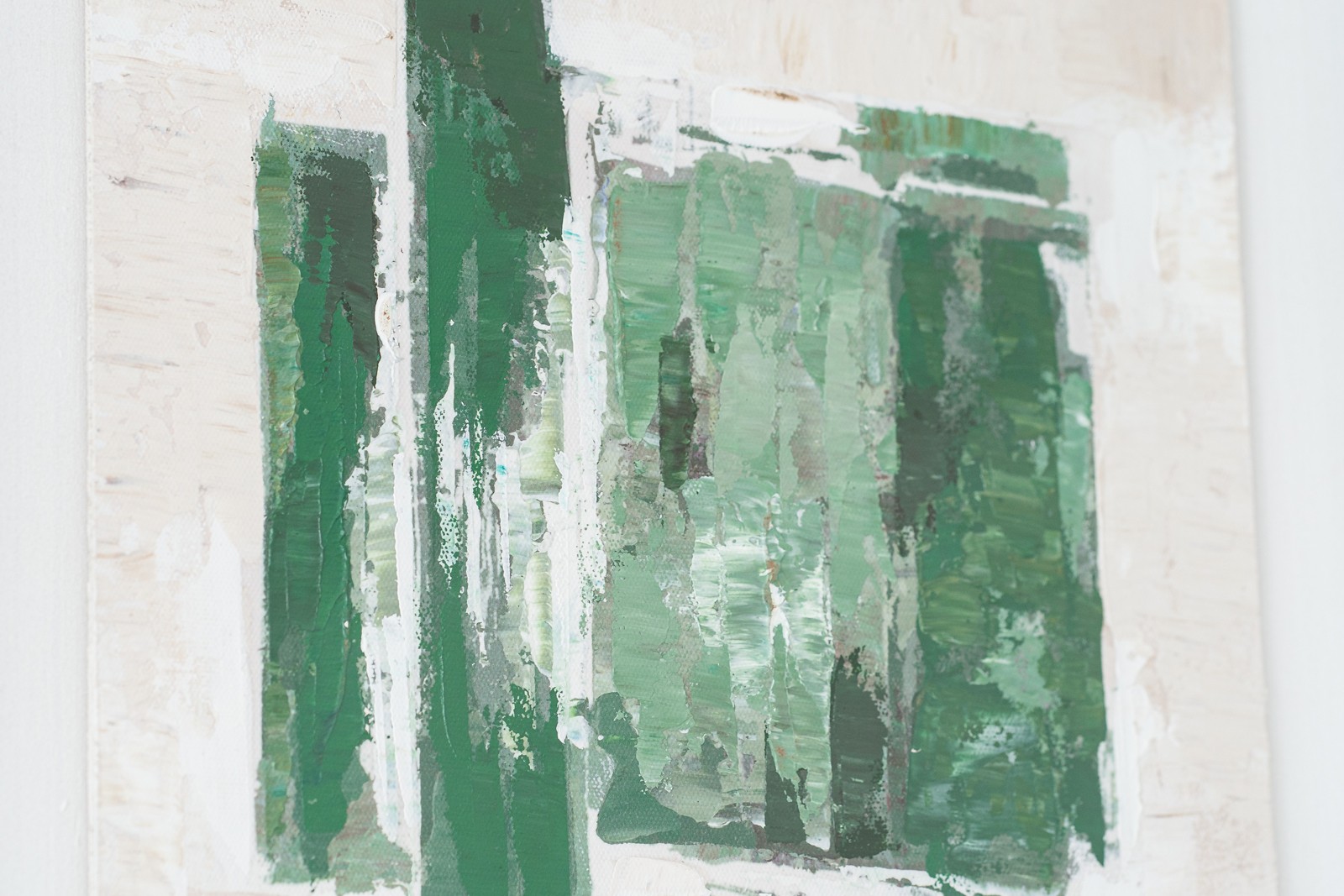 CUADRO ABSTRACTO VERDE. PINTURA REALIZADA A MANO SOBRE LIENZO. ABSTRACCIÓN EN TONO VERDE SOBRE UN FONDO EN BLANCO Y BEIGE. LA PINTURA SE APLICA CON UNA PINCELADA GRUESA BUSCANDO APORTAR TEXTURA Y DINAMISMO AL CUADRO. EL LIENZO PINTADO SE SUPERPONE AL FONDO BLANCO CREANDO UNA SENSACIÓN DE PROFUNDIDAD. MARCO EN COLOR NEGRO.