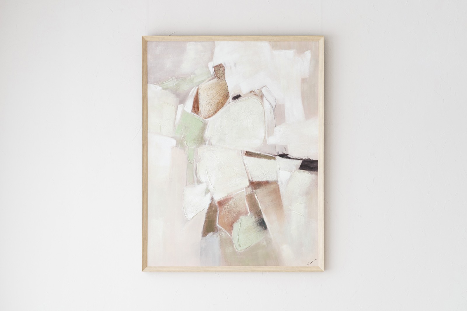 CUADRO ABSTRACTO OLI N1. PINTURA REALIZADA A MANO SOBRE LIENZO. CUADRO EN TONOS VERDE OLIVA BEIGE OCRES Y MARRONES APLICADOS BUSCANDO DAR TEXTURA Y RELIEVE A LA PINTURA. MARCO EN TONO NATURAL