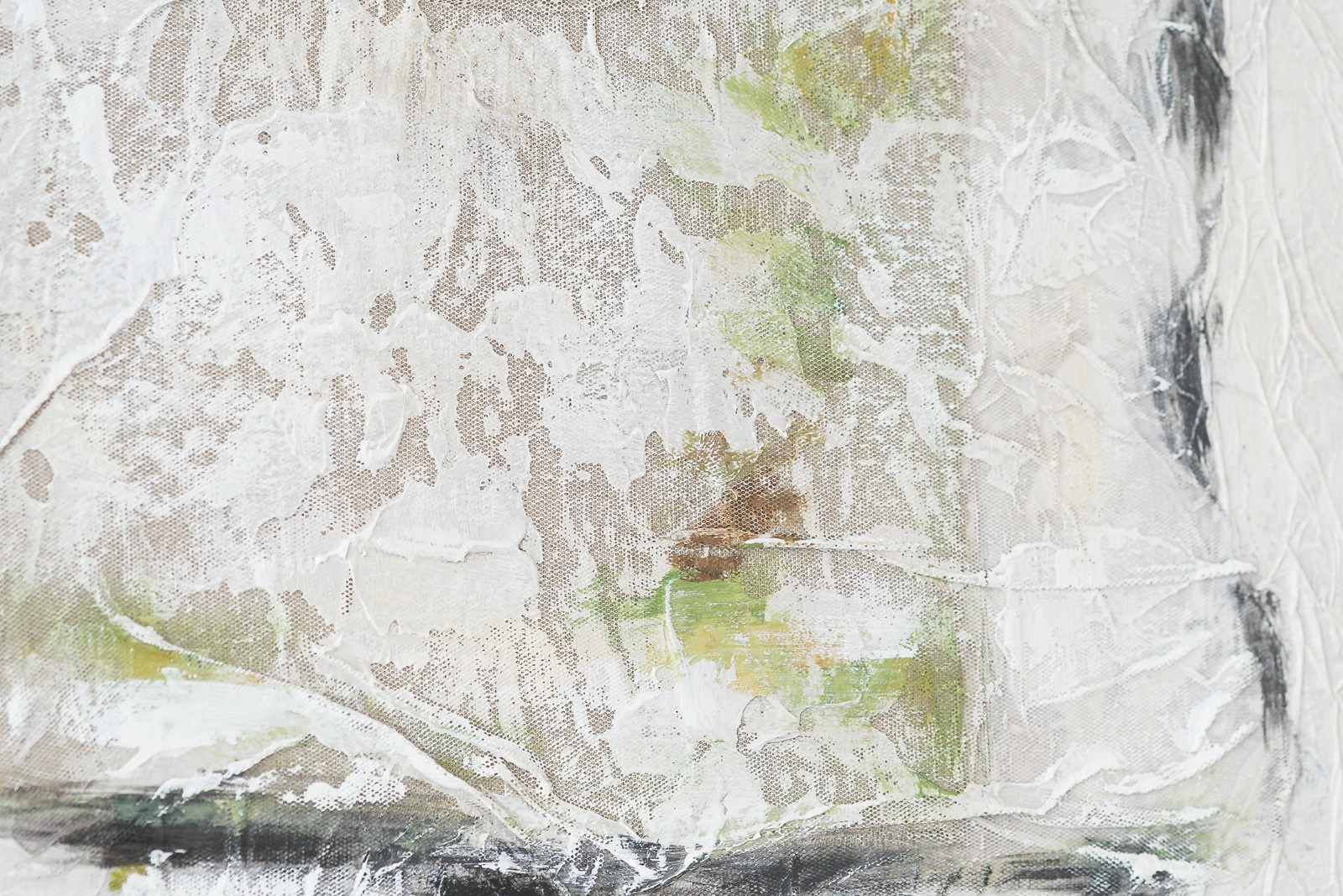 CUADRO ABSTRACCIÓN EN LINO N1. PINTURA REALIZADA A MANO EMPLEANDO UNA PIEZA DE LINO COMO MOTIVO CENTRAL SOBRE LA QUE SE APLICAN DISTINTAS TEXTURAS Y SE MEZCLAN TONOS BLANCOS BEIGE GRISES Y PINCELADAS EN VERDE LIMA. ENMARCADO CON PASPARTÚ EN TONO BLANCO ROTO VIDRIO Y MARCO EN COLOR NEGRO.