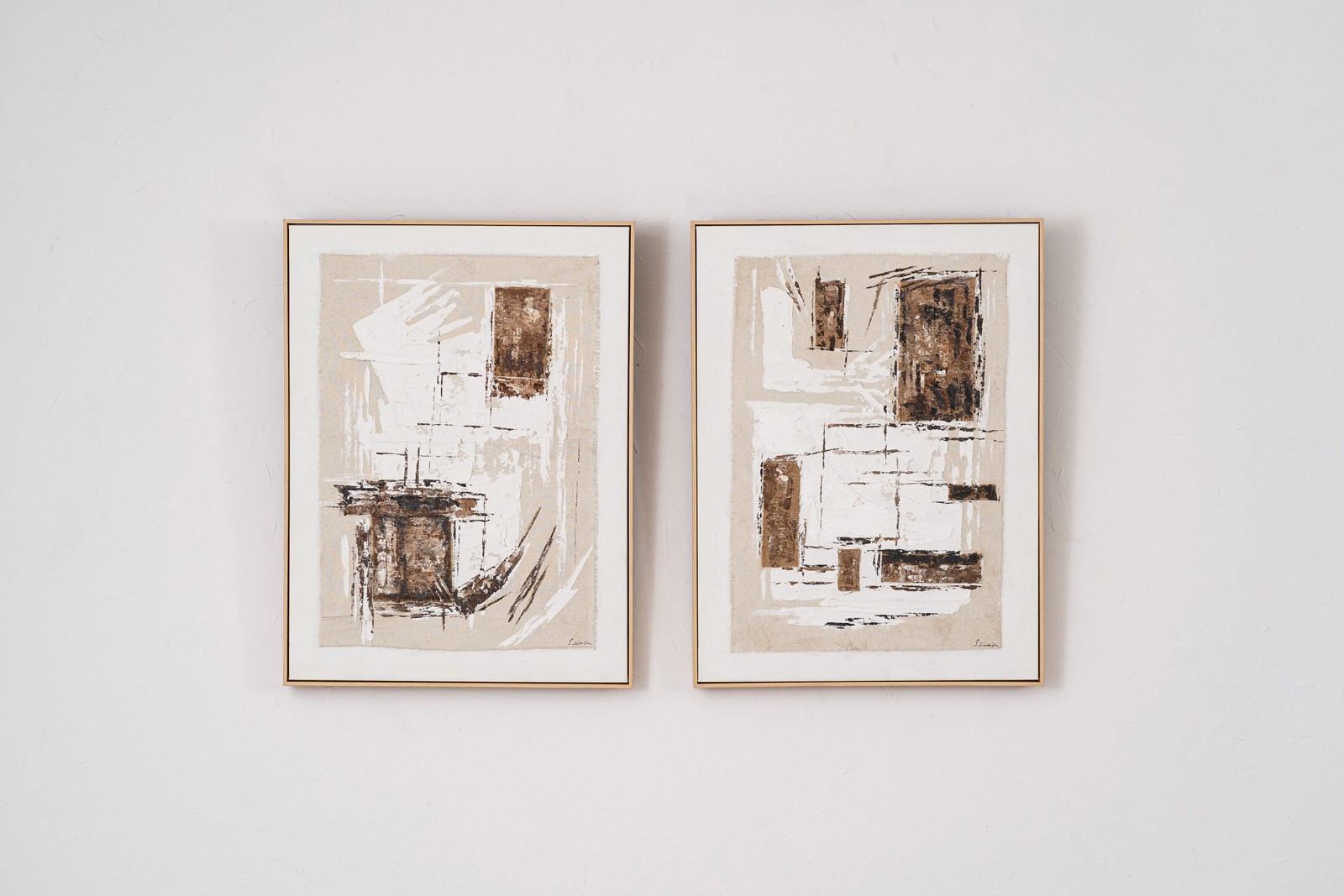 CUADRO ABSTRACTO ERO N1. PINTURA ACRÍLICA REALIZADA A MANO SOBRE LINO Y LIENZO. COMPOSICIÓN EQUILIBRADA EN TONOS TIERRA BLANCOS Y BEIGES. LAS PINCELADAS TEXTURIZADAS Y LOS CONTRASTES ENTRE ÁREAS CLARAS Y OSCURAS APORTAN PROFUNDIDAD Y UN CARÁCTER ARTESANAL A LA PIEZA. SU ESTÉTICA NEUTRA Y CONTEMPORÁNEA LO CONVIERTE EN UN ELEMENTO VERSÁTIL IDEAL PARA APORTAR CALIDEZ Y SOFISTICACIÓN A CUALQUIER ESPACIO. MARCO EN TONO MADERA CLARO.