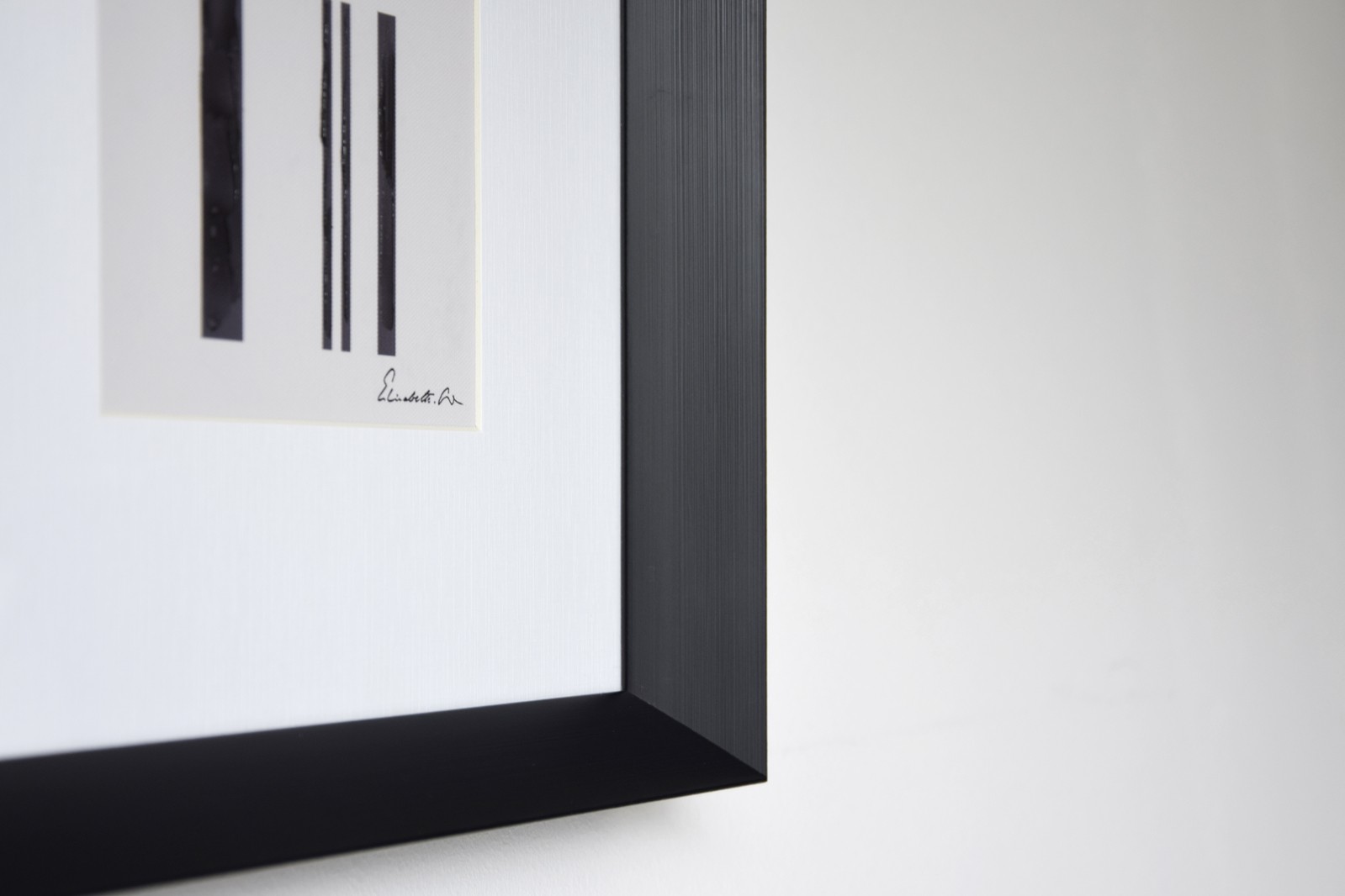 PINTURA ABSTRACTA A MANO SOBRE PAPEL CON MOTIVOS GEOMÉTRICOS EN COLOR NEGRO. ENMARCADA CON CRISTAL Y MARCO EN NEGRO