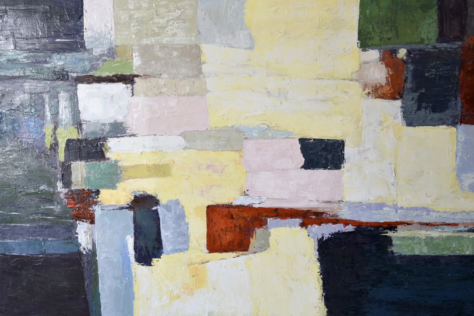 PINTURA ABSTRACTA REALIZADA A MANO SOBRE LIENZO EN TONOS GRISES AZULES OSCUROS ROJOS Y BLANCOS. MARCO EN ACABADO MADERA TONO NATURAL