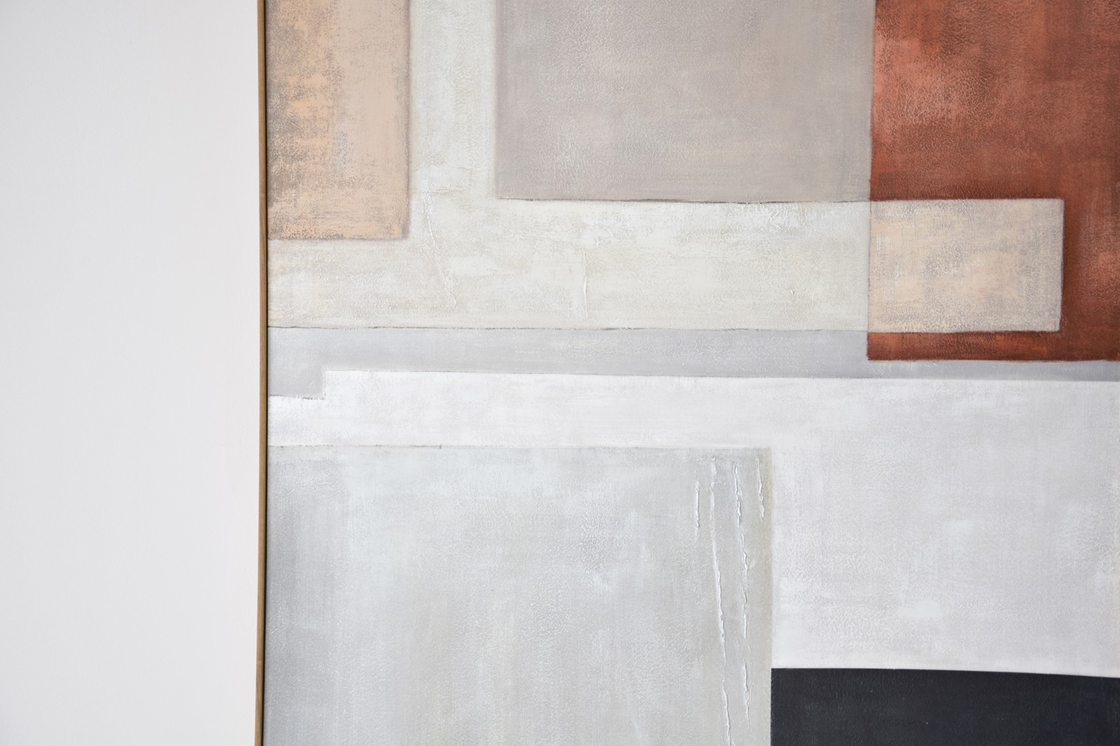 CUADRO SUPERPOSICIÓN EN TEJA N1. ACRÍLICO SOBRE LIENZO. PINTADO A MANO EN TONOS TEJA CREMA GRIS BLANCO Y NEGRO. MARCO EN ACABADO COLOR MADERA