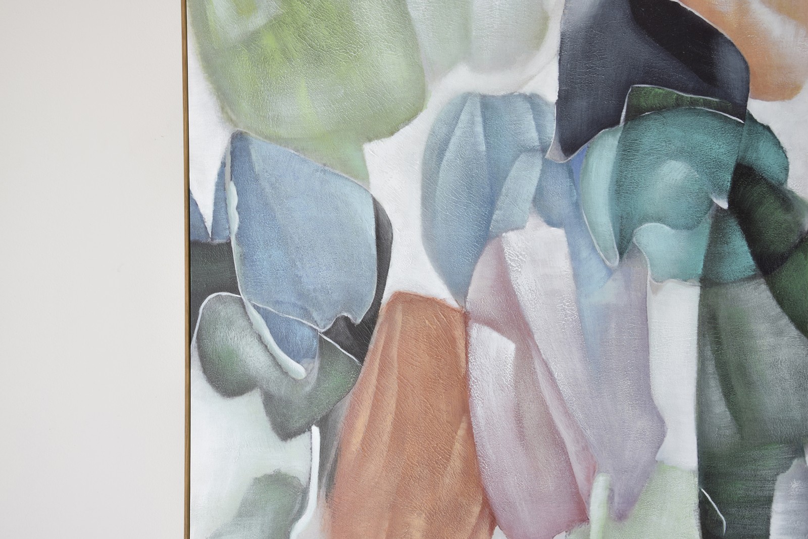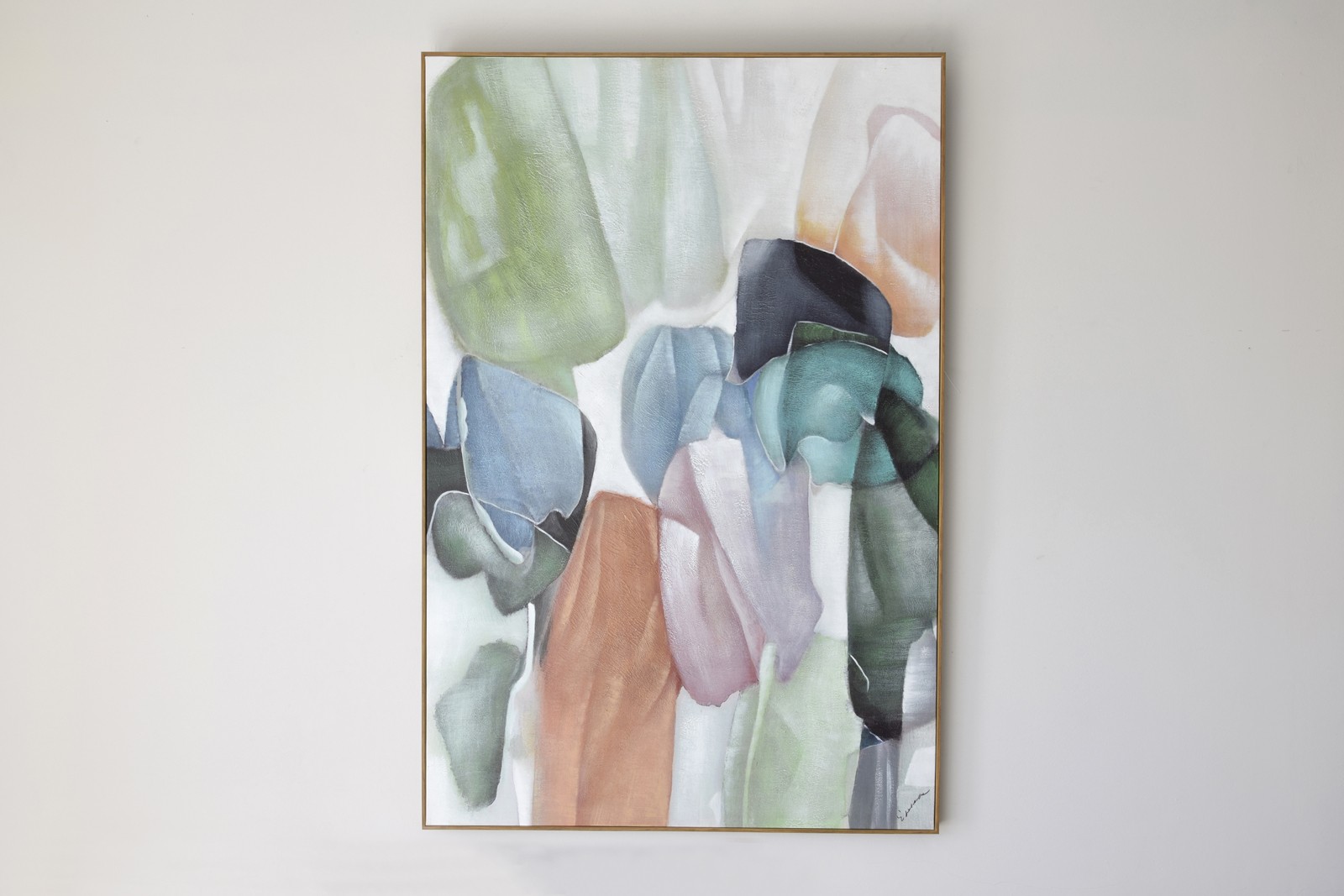 CUADRO ABSTRACTO ALEGRA N.3. ACRÍLICO SOBRE LIENZO. PINTADO A MANO EN TONOS VERDES BLANCOS Y NEGROS CON TOQUES DE OCRE. MARCO EN ACABADO COLOR MADERA