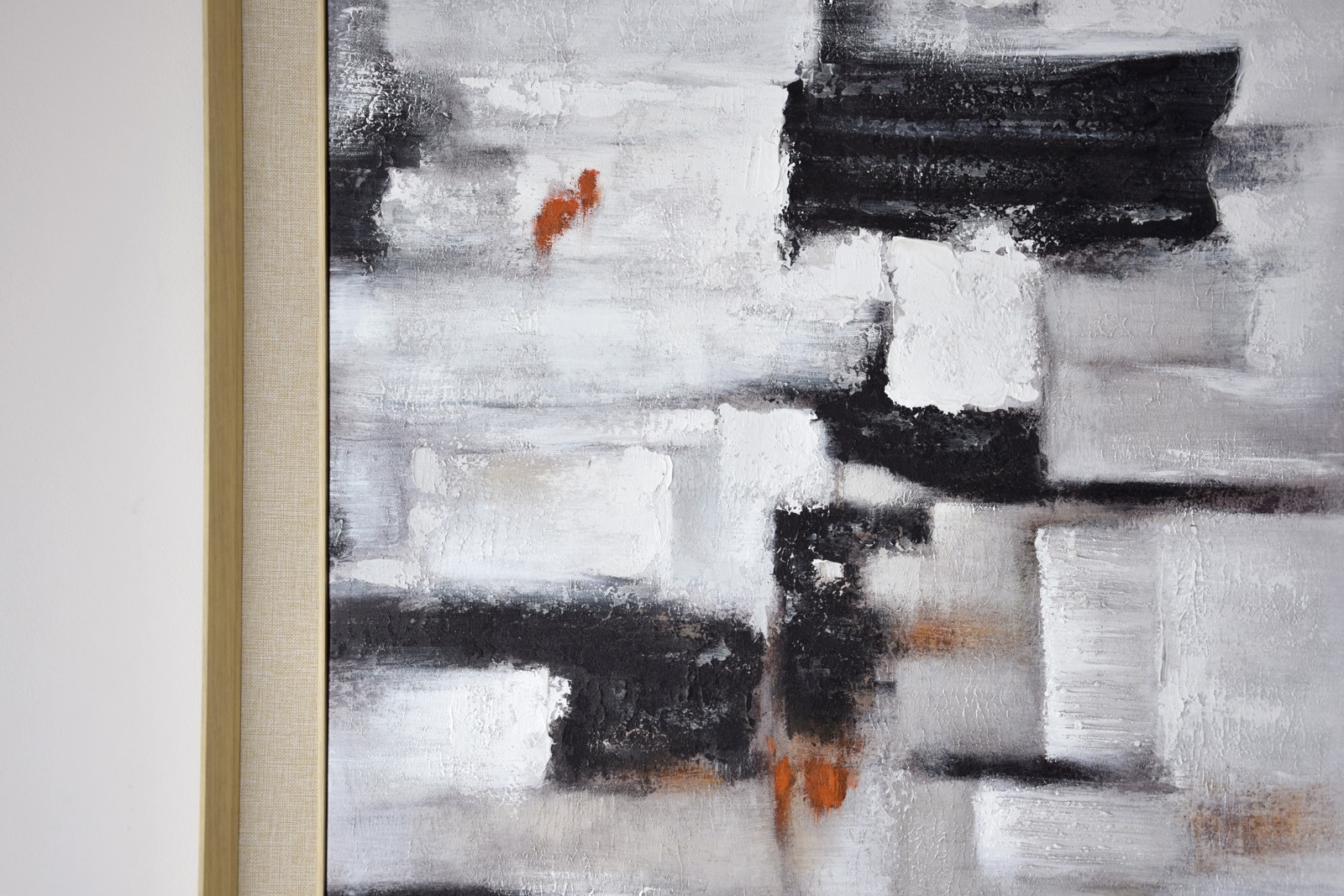 CUADRO TEXTURA N1. ACRÍLICO SOBRE LIENZO. PINTADO A MANO. PINTURA CON DISTINTAS TEXTURAS GRUESAS EN TONOS BLANCOS GRISES. NEGROS Y DOS LIGERAS PINCELADAS EN OCRE. EL CUADRO SE ENMARCA CON UN DOBLE MARCO EN ACABADO COLOR MADERA NATURAL Y UNA FRANJA DE LINO ENTRE AMBOS.