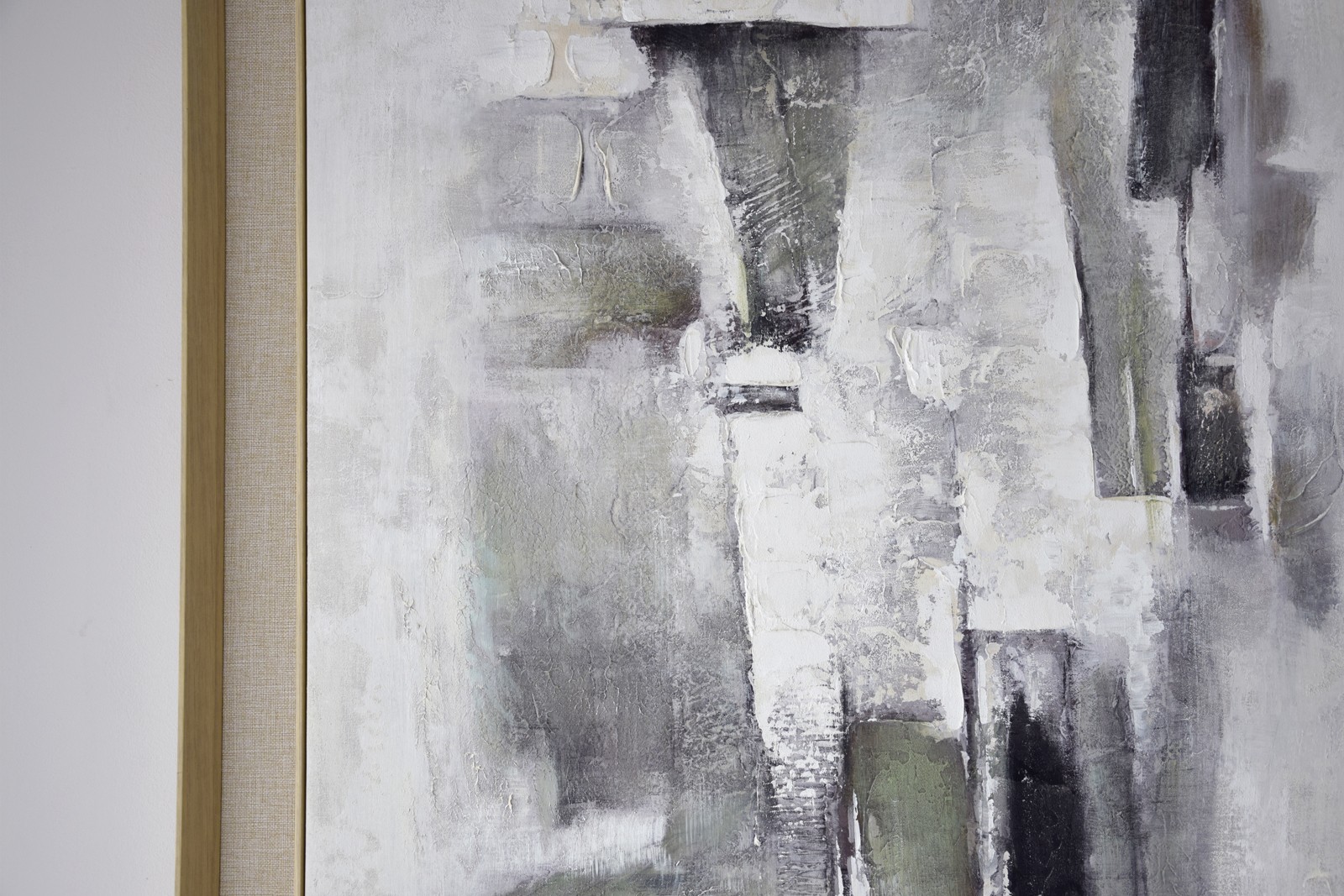 PINTURA TEXTURA N2. ACRILICO SOBRE LIENZO. PINTADO A MANO. CUADRO CON DIFERENTES TEXTURAS Y FORMAS QUE MEZCLA UN VERDE MUSGO CON NEGRO Y BLANCO. EL CUADRO ESTA ENMARCADO CON UN DOBLE BASTIDOR EN ACABADO COLOR MADERA NATURAL Y UNA TIRA DE LINO ENTRE ELLOS.