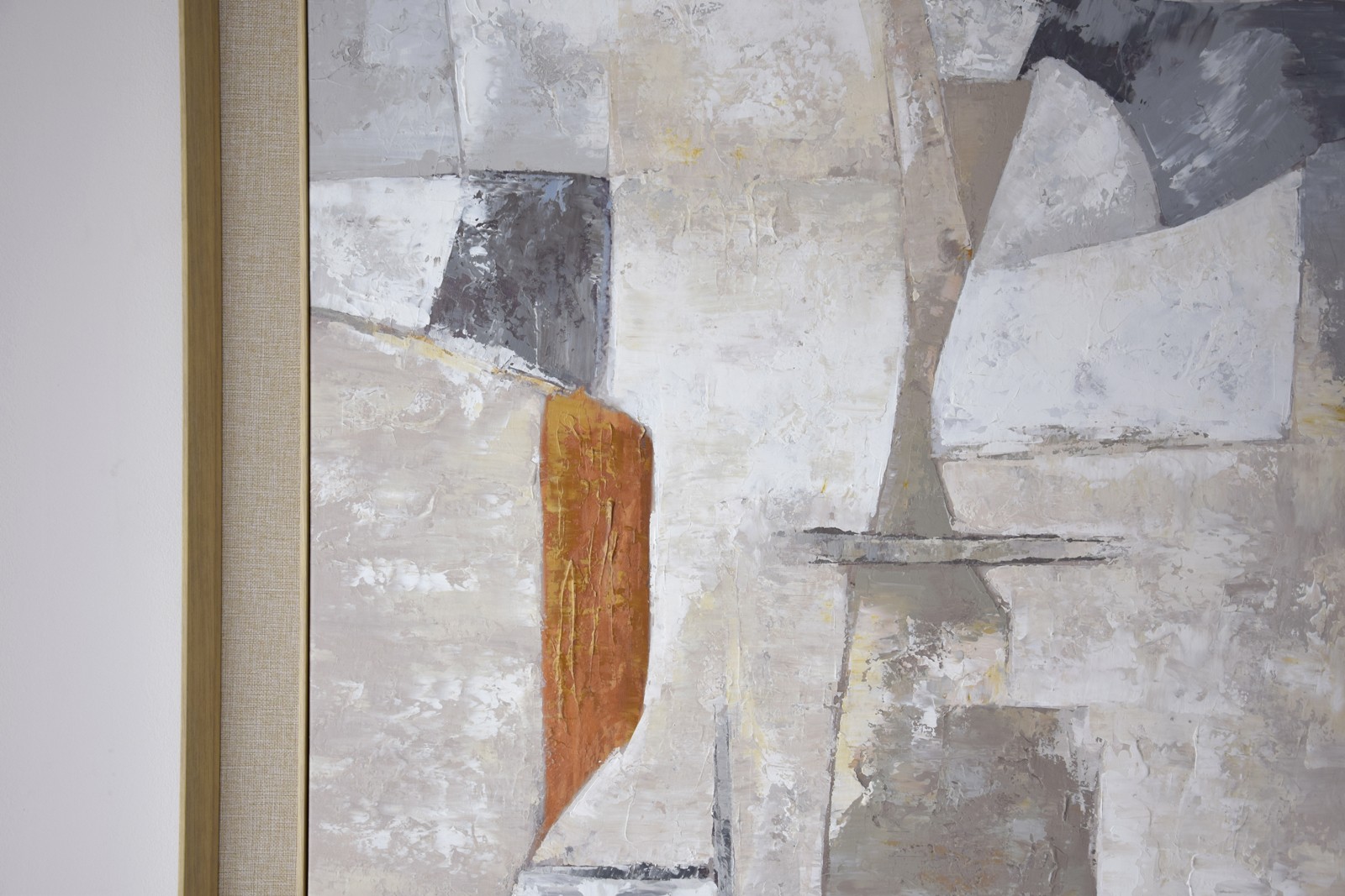PINTURA ABSTRACTA N2. ACRÍLICO SOBRE LIENZO. PINTADO A MANO. CUADRO CON SUAVES TEXTURAS SUPERPUESTAS HACIENDO UNA ESPECIE DE VELADURA EN TONOS CÁLIDOS JUNTO CON EL BLANCO Y PINCELADAS EN NEGRO. EL CUADRO ESTA ENMARCADO CON UN DOBLE BASTIDOR EN ACABADO COLOR MADERA NATURAL Y UNA FRANJA DE LINO ENTRE ELLOS.