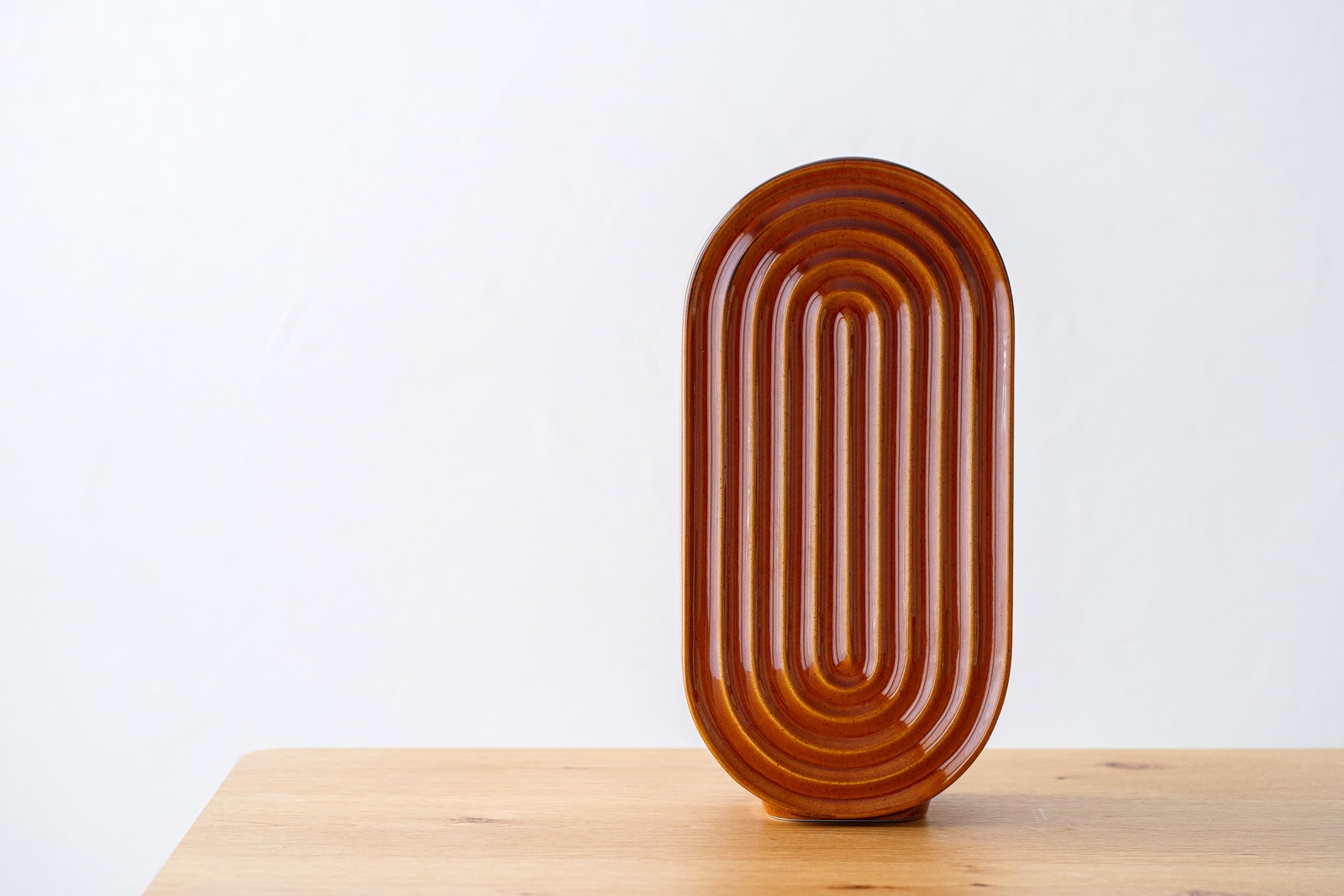 JARRÓN COLECCIÓN NERVA. TONO CARAMELO. BRILLO. JARRÓN DECORATIVO DE CERÁMICA CON FORMA OVALADA ALARGADA Y DISEÑO EN RELIEVE DE LÍNEAS CURVAS CONCÉNTRICAS QUE CREAN UN EFECTO VISUAL MODERNO Y DINÁMICO. SU ACABADO ESMALTADO EN UN TOINO CARAMELO APORTA CALIDEZ Y CARÁCTER A CUALQUIER AMBIENTE. ESTA PIEZA ESCULTÓRICA ES IDEAL PARA COMPLEMENTAR ESPACIOS CONTEMPORÁNEOS YA SEA COMO OBJETO DECORATIVO INDEPENDIENTE O ACOMPAÑADA DE OTROS ELEMENTOS DE DISEÑO COMO SU PAREJA EN ACABADO BLANCO MATE.