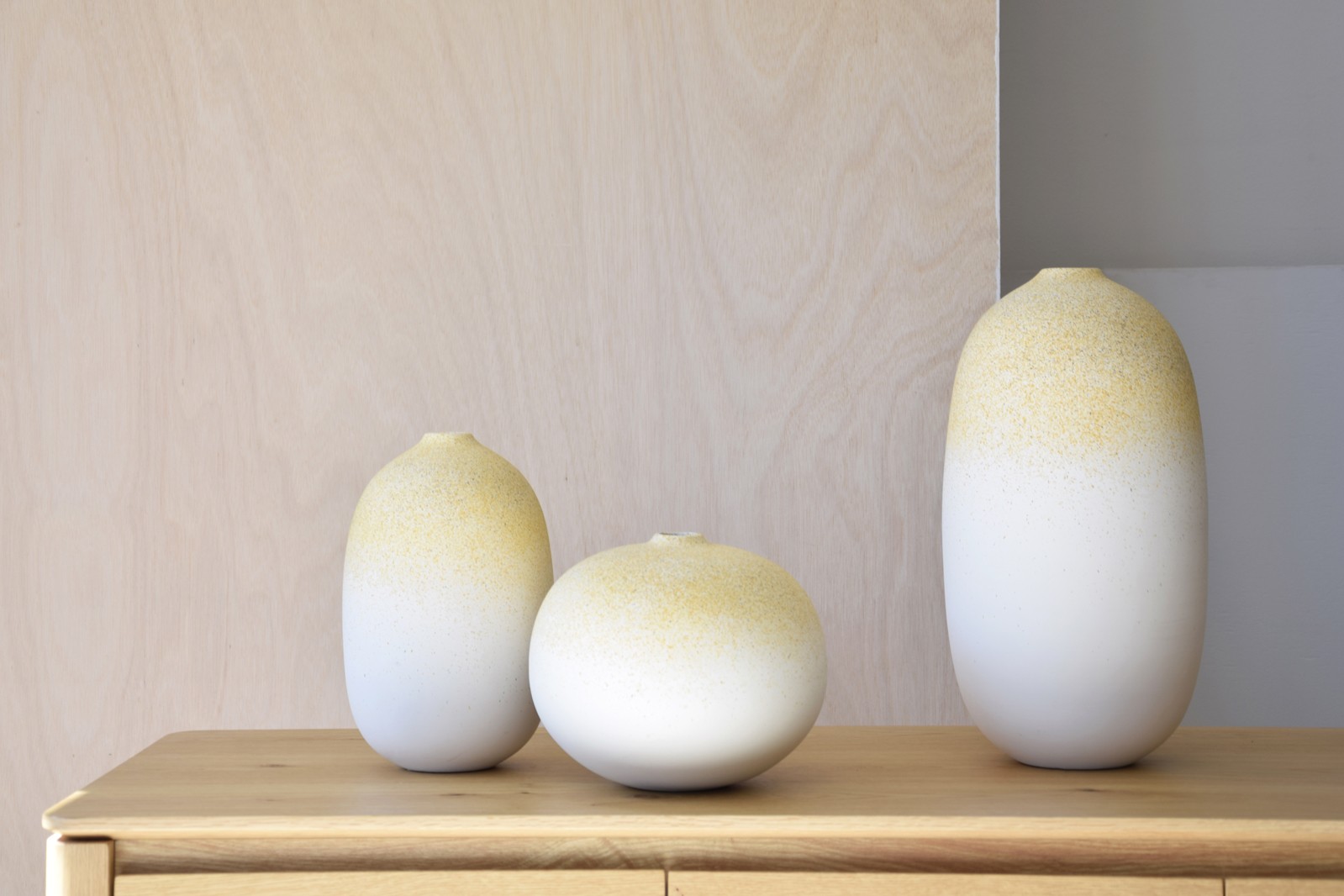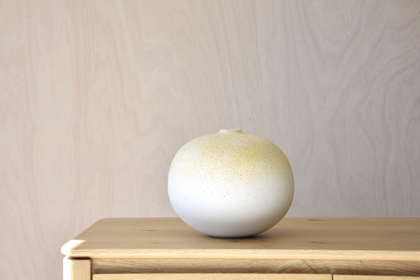 JARRÓN REALIZADO EN CERÁMICA EN FORMA ESFÉRICA PRESENTA UNA TEXTURA SUTILMENTE RUGOSA QUE ENRIQUECE EL ACABADO DEGRADADO ELEGIDO QUE VA DESDE UN TONO AMARILLO DE LA FLOR "XESTA" HASTA UN BLANCO ROTO PRESENTE EN LA BASE DE LA PIEZA. FORMA Y COLOR CREAN UN ELEMENTO DECORATIVO FRESCO Y NATURAL QUE TRANSMITE EL CARÁCTER ARTESANAL DE ESTAS PIEZAS. DEBIDO A LA FORMA DE PRODUCCIÓN ES POSIBLE QUE HAYA VARIACIONES DE COLOR DE UNAS PIEZAS A OTRAS. TAMAÑO PEQUEÑO
