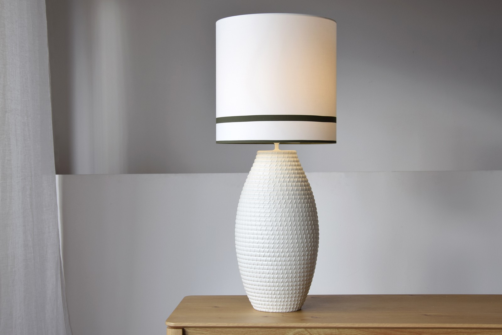 LÁMPARA DE MESA MARRUECOS REALIZADA EN CERÁMICA EN COLOR BLANCO ROTO CON PINTAS. LA BASE SE CARACTERIZA POR UN DELICADO RELIEVE QUE RECUERDA UNA CUERDA ENROLLADA A LO LARGO DE TODA LA PIEZA RESALTANDO EL CARACTER ARTESANAL DE LA MISMA Y ACERCÁNDONOS A LA TRADICIÓN DE LA ARTESANÍA MARROQUÍ. LA PANTALLA ESTÁ REALIZADA EN ALGODÓN BLANCO ROTO CON VIVO A 6 CM DE LA PARTE INFERIOR EN VERDE OSCURO REMARCANDO LA BASE DE LA PANTALLA. MEDIDAS BASE LAMP: 26x26x51CM. MEDIDA PANTALLA :38x38CM. CASQUILLO E27