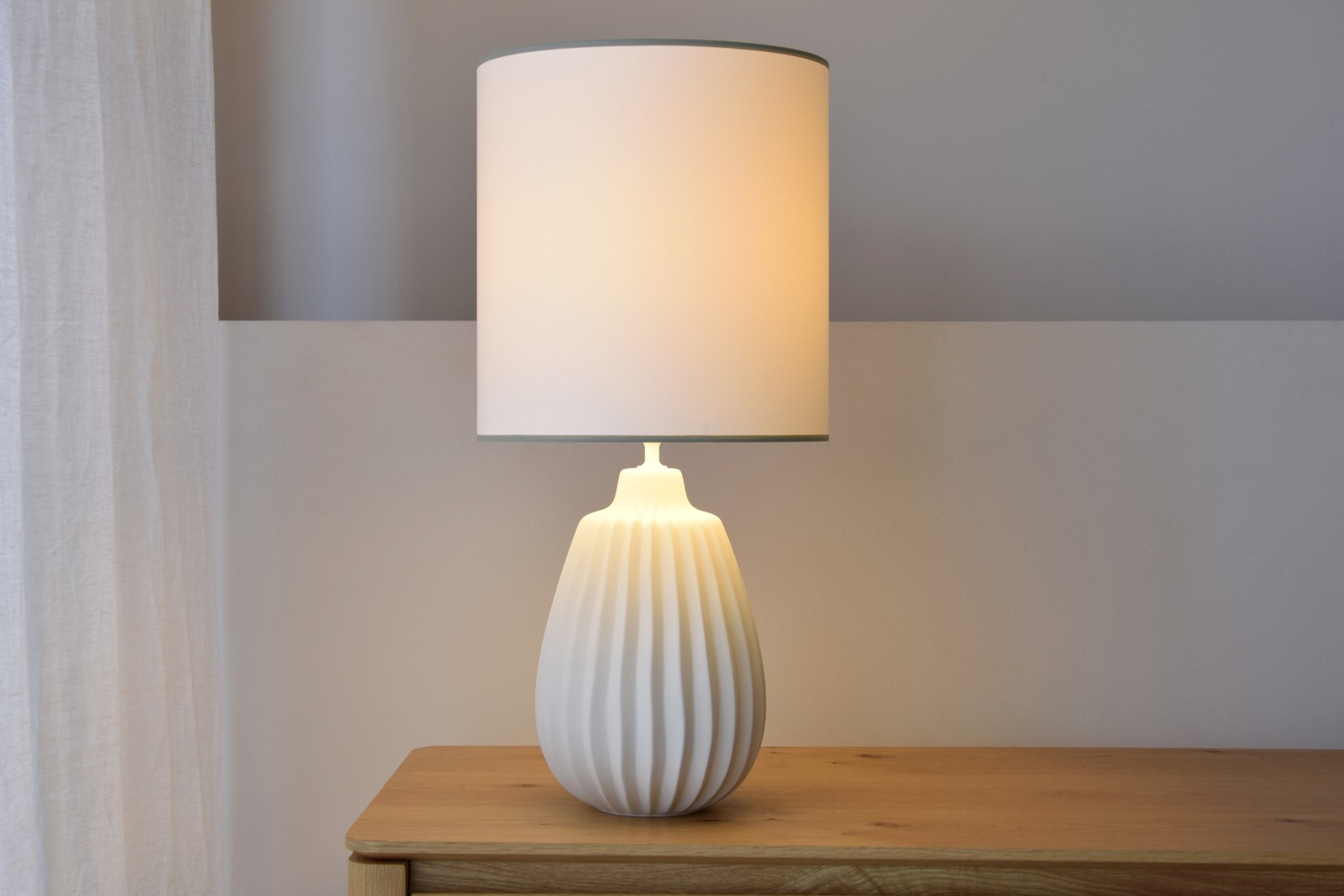 LÁMPARA DE MESA REALIZADA EN CERÁMICA CON UN ACABADO EN CHACOTA NATURAL MATE. LA BASE CUENTA CON UN RELIVE EN FORMA DE FUELLE VERTICAL QUE LA CONVIERTE EN UNA PIEZA DELICADA Y DECORATIVA PERFECTA EN UN SALÓN HABITACIÓN O RECEPCIÓN.. SE HA SELECCIONADO UNA PANTALLA CILÍNDRICA EN ALGODÓN BLANCO ROTO CON RIBETES EN VERDE LÍQUEN HACIENDO UN CONJUNTO EQUILIBRADO QUE COMBINA CON DISTINTO ESTILOS DE DECORACIÓN. SE TRATA DE UNA PRODCUIÓN ARTESANAL POR LO QUE PUEDE HABER DIFERENCIAS DE UNAS PIEZAS A OTRAS.