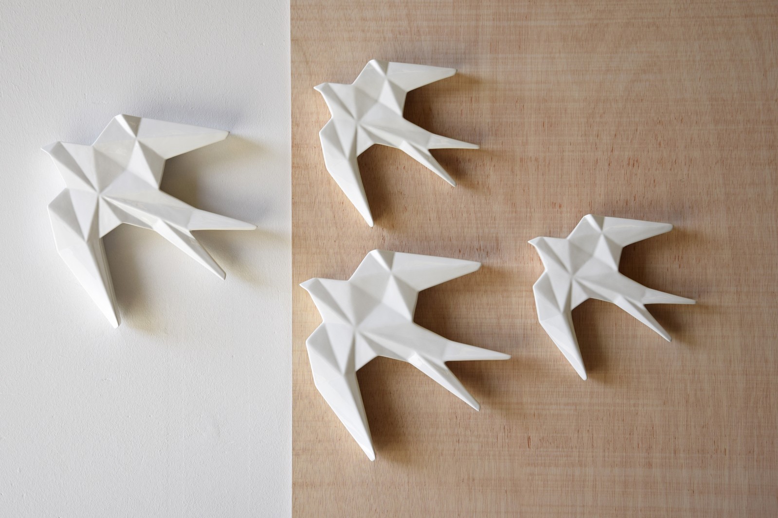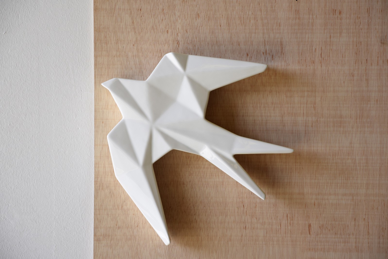 ANDURIÑA PARA COLGAR EN PARED REALIZADA EN CERÁMICA DE COLOR BLANCO ACABADO BRILLO. SU PRODUCCIÓN ARTESANAL Y LA APLICACION TOTALMENTE A MANO DEL COLOR CONVIERTEN A CADA PIEZA EN UN ELEMENTO ÚNICO OBTENIENDO DISTINTOS MATICES DEL COLOR QUE APORTAN UN EFECTO SINGULAR A CADA ESPACIO .TAMAÑO GRANDE.