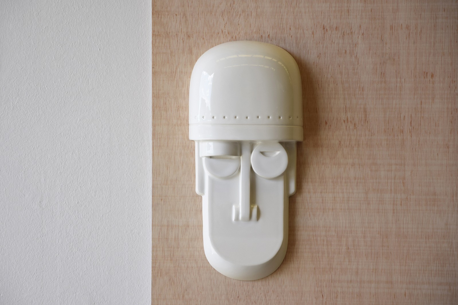 MÁSCARA PARA COLGAR REALIZADA DE MANERA ARTESANAL EN CERÁMICA COLOR BLANCO ACABADO BRILLO.