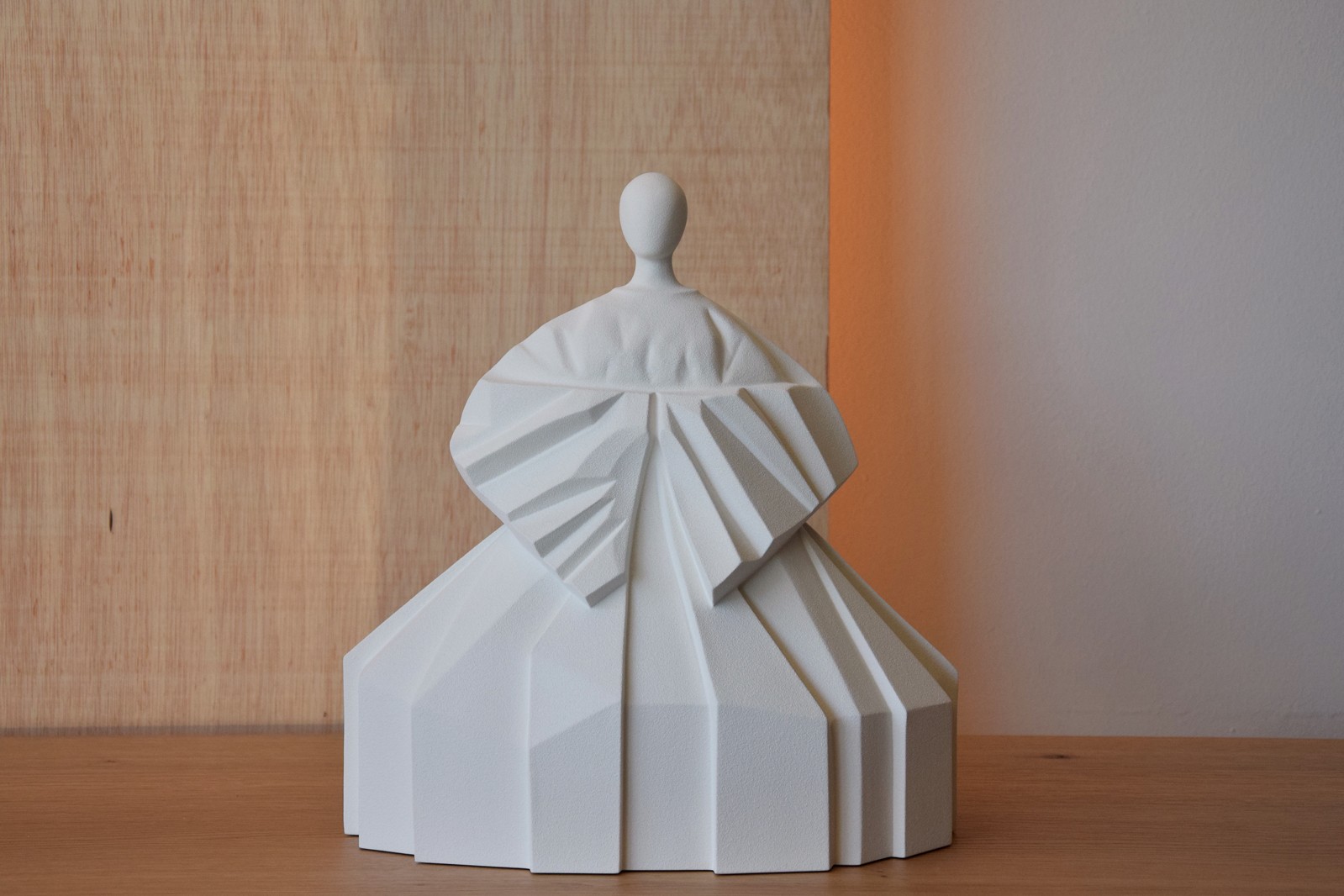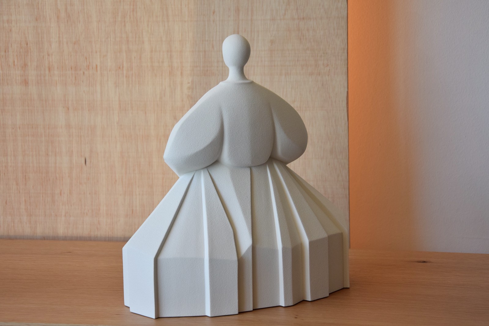 FIGURA MUJER JAPONESA CON REPRESENTACIÓN CONCEPTUAL Y GEOMÉTRICA DE VESTIMENTA TRADICIONAL . REALIZADA EN CERÁMICA COLOR BLANCO ROTO Y ACABADO TEXTURA RUGOSO.