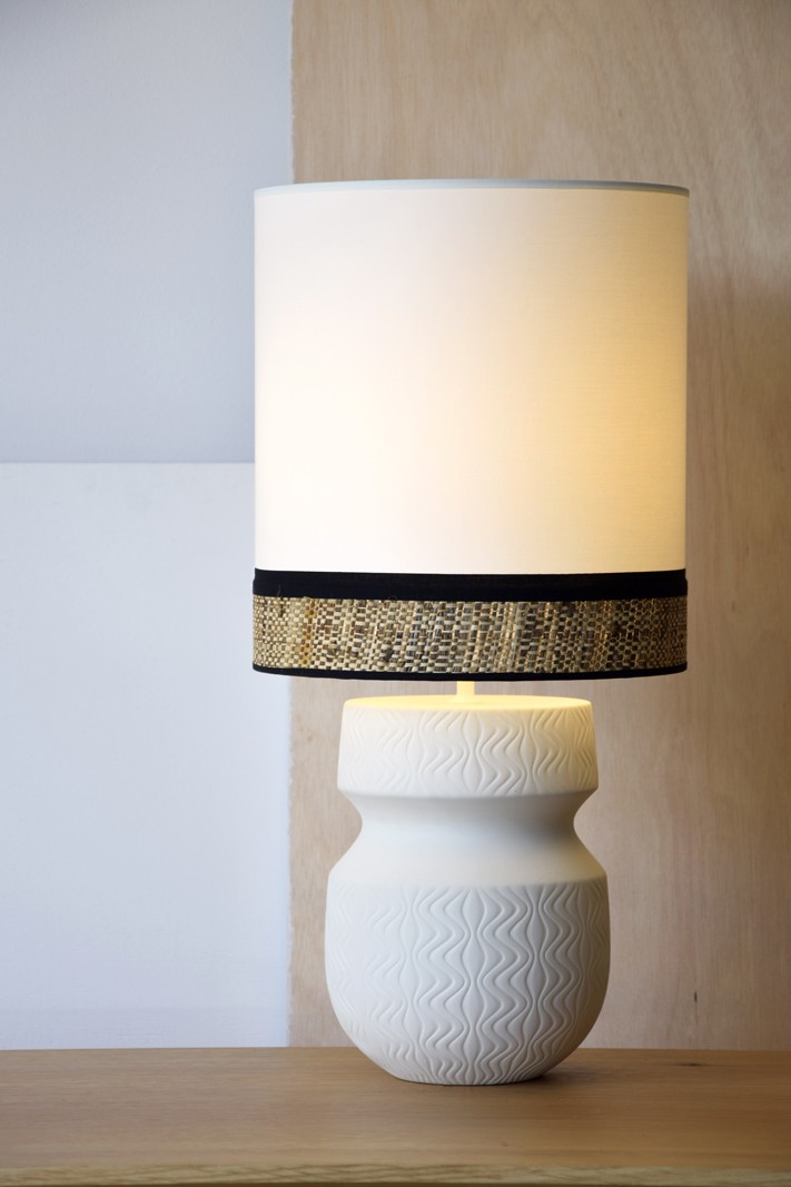 LÁMPARA DE MESA REALIZADA EN PASTA CERÁMICA CON ACABADO NATURAL MATE. PANTALLA CILÍNDRICA REALIZADA EN ALGODÓN BLANCO ROTO VIVO INFERIOR DE 6 CM EN RAFIA NATURAL Y VIVO DE UNION EN NEGRO. MEDIDAS BASE LAMP: 20X25CM. MEDIDA PANTALLA:30XH33CM