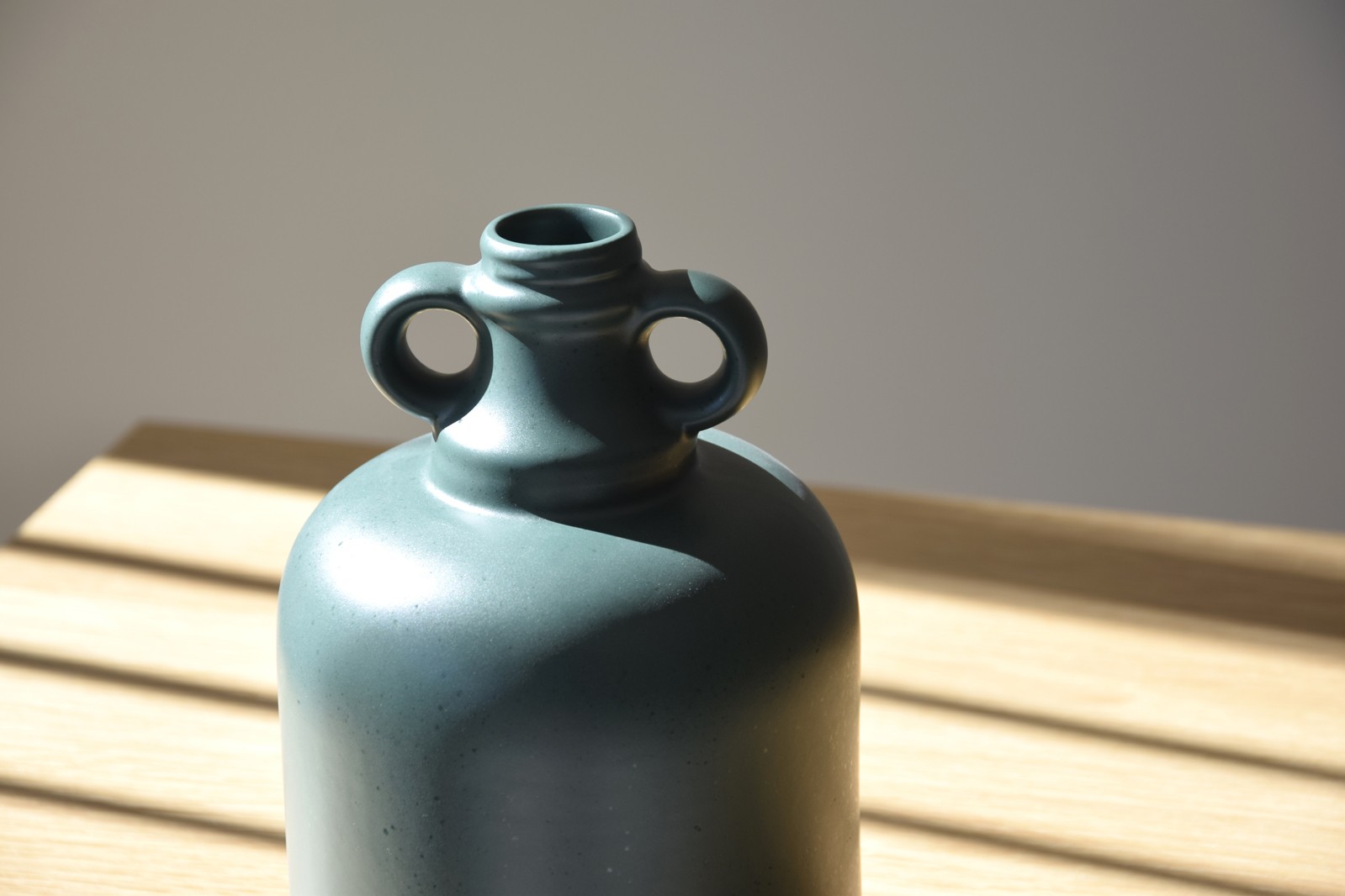 PIEZA REALIZADA EN CERÁMICA EN FORMA DE GARRAFA ANTIGUA CON DOS ASAS TIENE UN COLOR VERDE BOTELLA OSCURO MATE CON UNAS PEQUEÑAS PINTAS EN ACABADO SUTILMENTE SATINADO QUE HACEN QUE LA SUPERFICE PUEDA VARIAR CON LOS REFLEJOS DE LA LUZ. DADO EL CARÁCTER ARTESANAL DE ESTAS PIEZAS Y LO ESPECIAL DE SU VIDRIADO ES POSIBLE QUE HAYA VARIACIONES DE COLOR DE UNAS PIEZAS A OTRAS.TAMAÑO PEQUEÑO