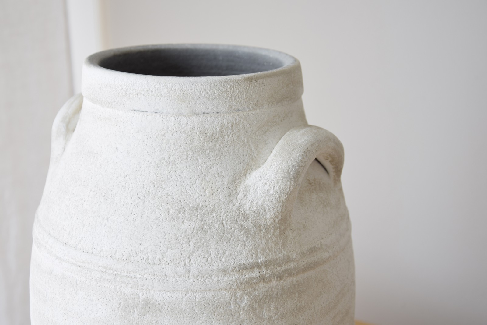 ÁNFORA CON DOS ASAS REALIZADA EN CERÁMICA. SE ENFATIZA EL VOLUMEN DE LA PIEZA MEDIANTE EL USO DE DOBLES LÍNEAS EN LA PARTE CENTRAL CONSIGUIENDO UN DISEÑO MÁS TRABAJADO QUE JUNTO CON EL ACABADO IRREGULAR EN TONOS DISTINTOS DE BLANCO Y LA APLICACIÓN DE UNA PÁTINA SUPERFICIAL HACEN QUE LA COLECCIÓN TENGA UNA HISTORIA QUE CONTAR. DADO EL CARÁCTER ARTESANAL DE ESTAS PIEZAS Y LO ESPECIAL DE SU VIDRIADO ES POSIBLE QUE HAYA VARIACIONES DE UNAS PIEZAS A OTRAS. TAMAÑO BAJO