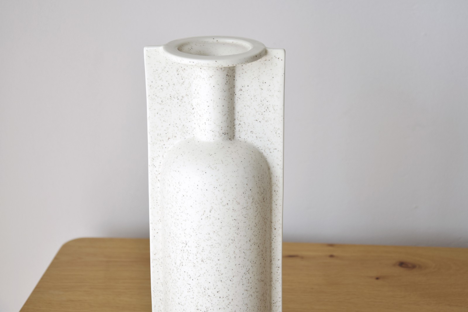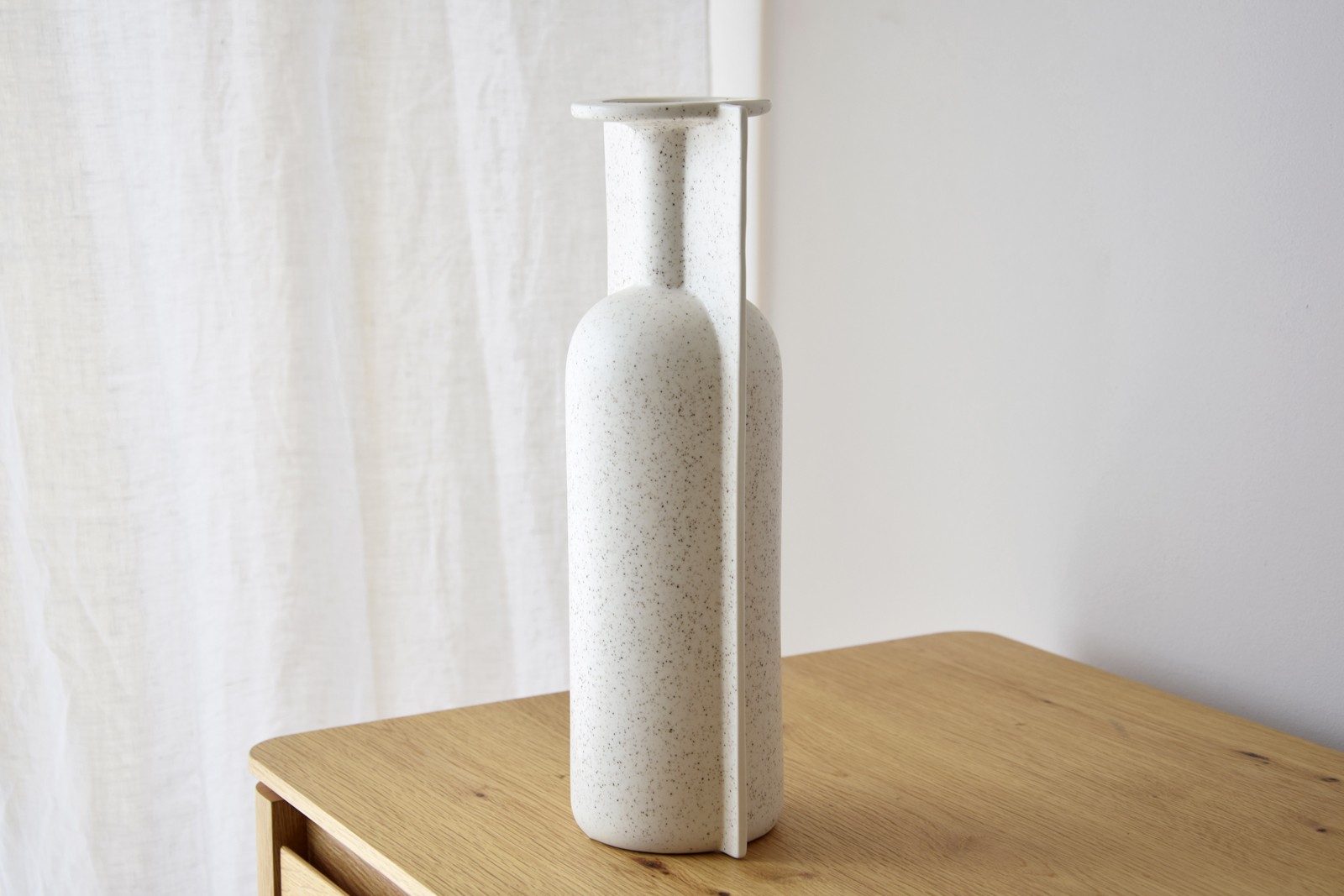 JARRÓN EN CERÁMICA CUYO DISEÑO INCORPORA UN PLANO VERTICAL QUE DIVIDE SIMÉTRICAMENTE LA PIEZA CON FORMA ORIGINAL DE BOTELLA. DELICADO Y DIFERENTE ESTE JARRÓN MATE EN TONO BLANCO ROTO CON PINTAS EN CASTAÑO ES UN OBJETO DE DECORACIÓN PERFECTO PARA CUALQUIER ESPACIO. DADO EL CARÁCTER ARTESANAL DE ESTAS PIEZAS Y LO ESPECIAL DE SU VIDRIADO ES POSIBLE QUE HAYA VARIACIONES DE COLOR DE UNAS PIEZAS A OTRAS.