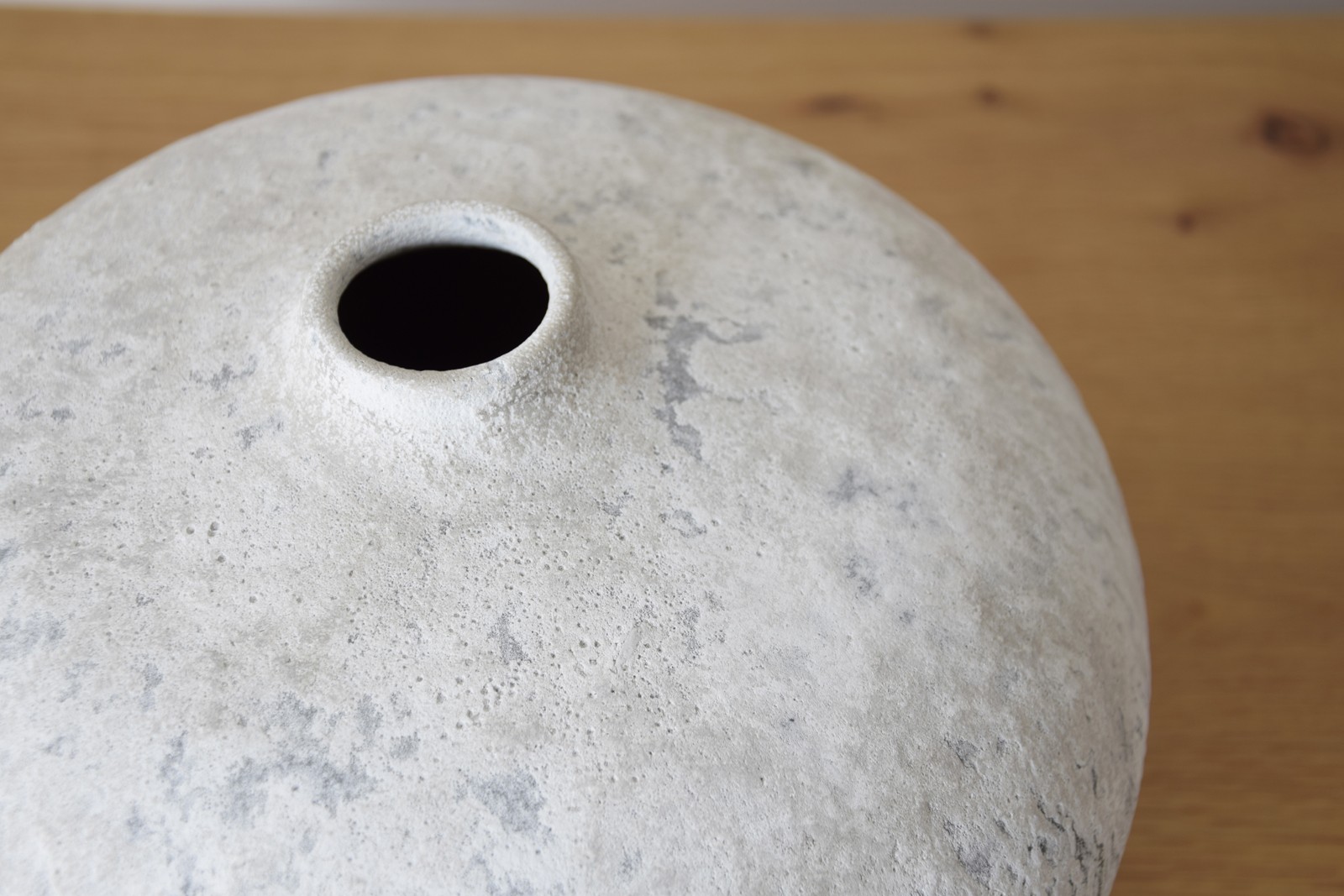 JARRÓN REALIZADO EN CERÁMICA CON ACABADO ARTESANAL IRREGULAR EN TONOS BLANCOS Y GRISES CLAROS CON CIERTA TEXTURA RUGOSA QUE LE DA A LA PIEZA UN CARÁCTER ENVEJECIDO PERO LUMINOSO. DADO EL CARÁCTER ARTESANAL DE ESTAS PIEZAS Y LO ESPECIAL DE SU VIDRIADO ES POSIBLE QUE HAYA VARIACIONES DE UNAS PIEZAS A OTRAS.TAMAÑO BAJO