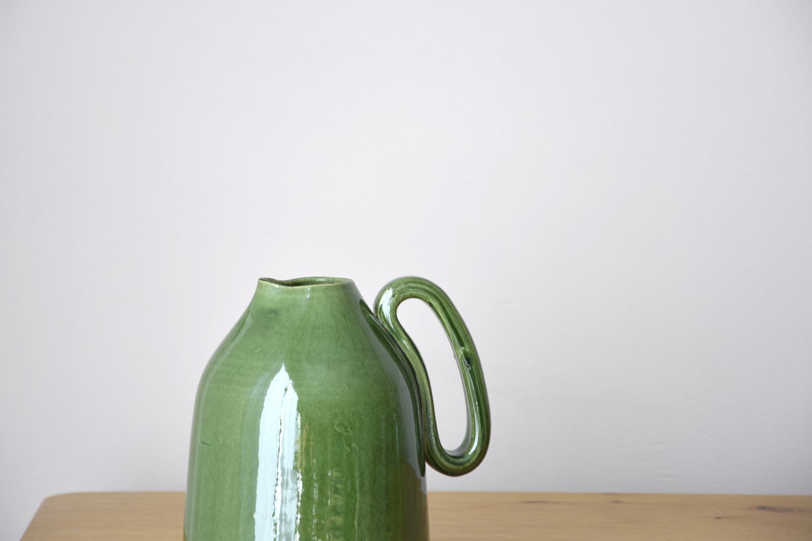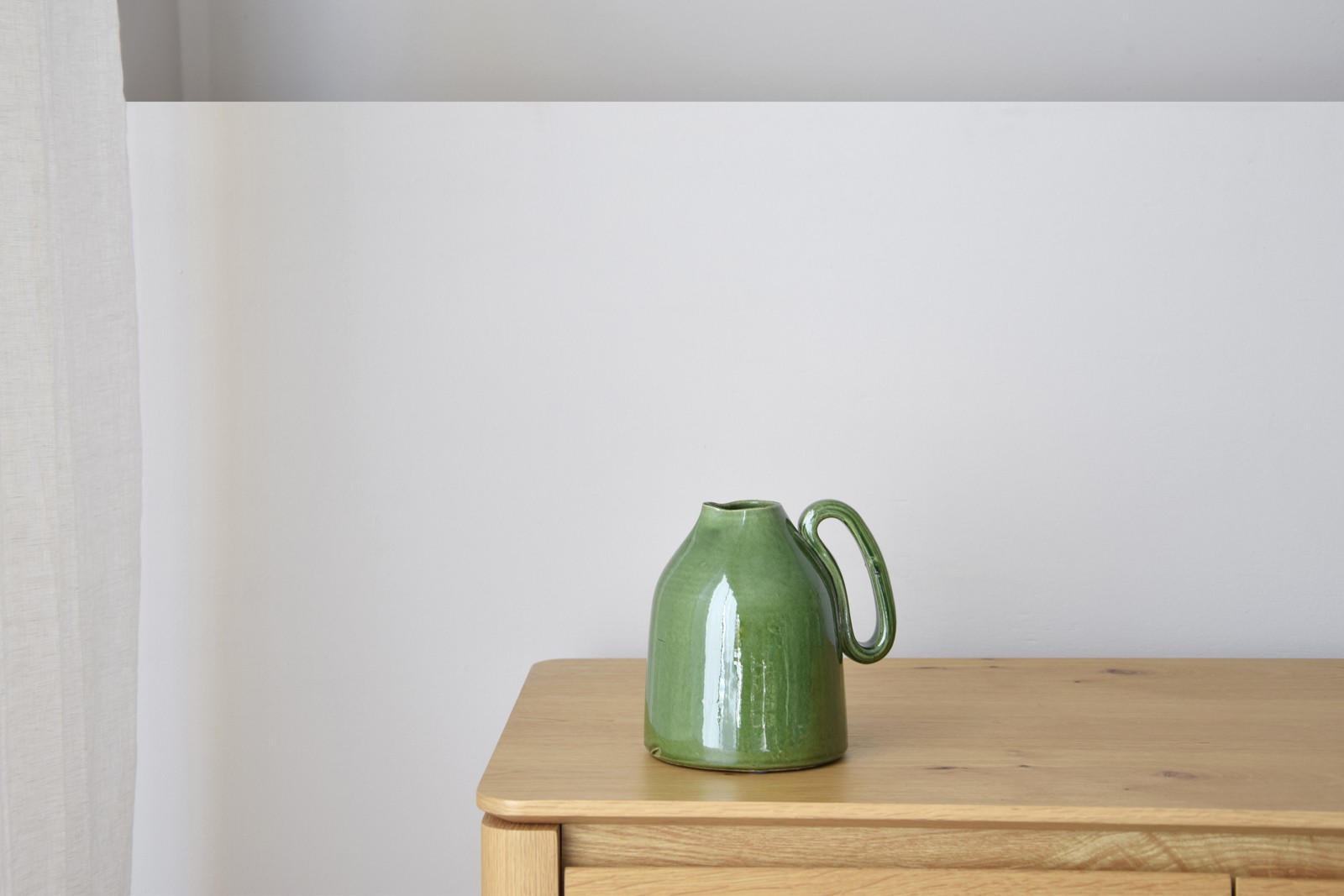 JARRA COLECCIÓN BELA. TAMAÑO PEQUEÑO.JARRA REALIZADA EN CERÁMICA CON UNA ORIGINAL ASA DE FORMA REDONDEADA. LA PIEZA ESTÁ VIDRIADA EN UN PROFUNDO TONO VERDE CON ACABADO BRILLO. EL DECORADO DE ESTAS PIEZAS SE REALIZA A MANO POR LO QUE EL PROCESO DE VIDRIADO ES DIFERENTE EN CADA UNA LO QUE APORTA A CADA PIEZA UN CARÁCTER ÚNICO Y DISTINTO. DADO EL CARÁCTER ARTESANAL DE ESTAS PIEZAS Y LO ESPECIAL DE SU VIDRIADO ES POSIBLE QUE HAYA VARIACIONES DE COLOR Y ACABADO.