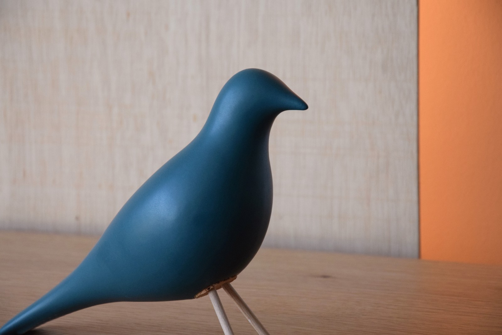 PÁJARO REALIZADO EN CERÁMICA EN COLOR AZUL PETRÓLEO MATE. PATAS EN MADERA NATURAL