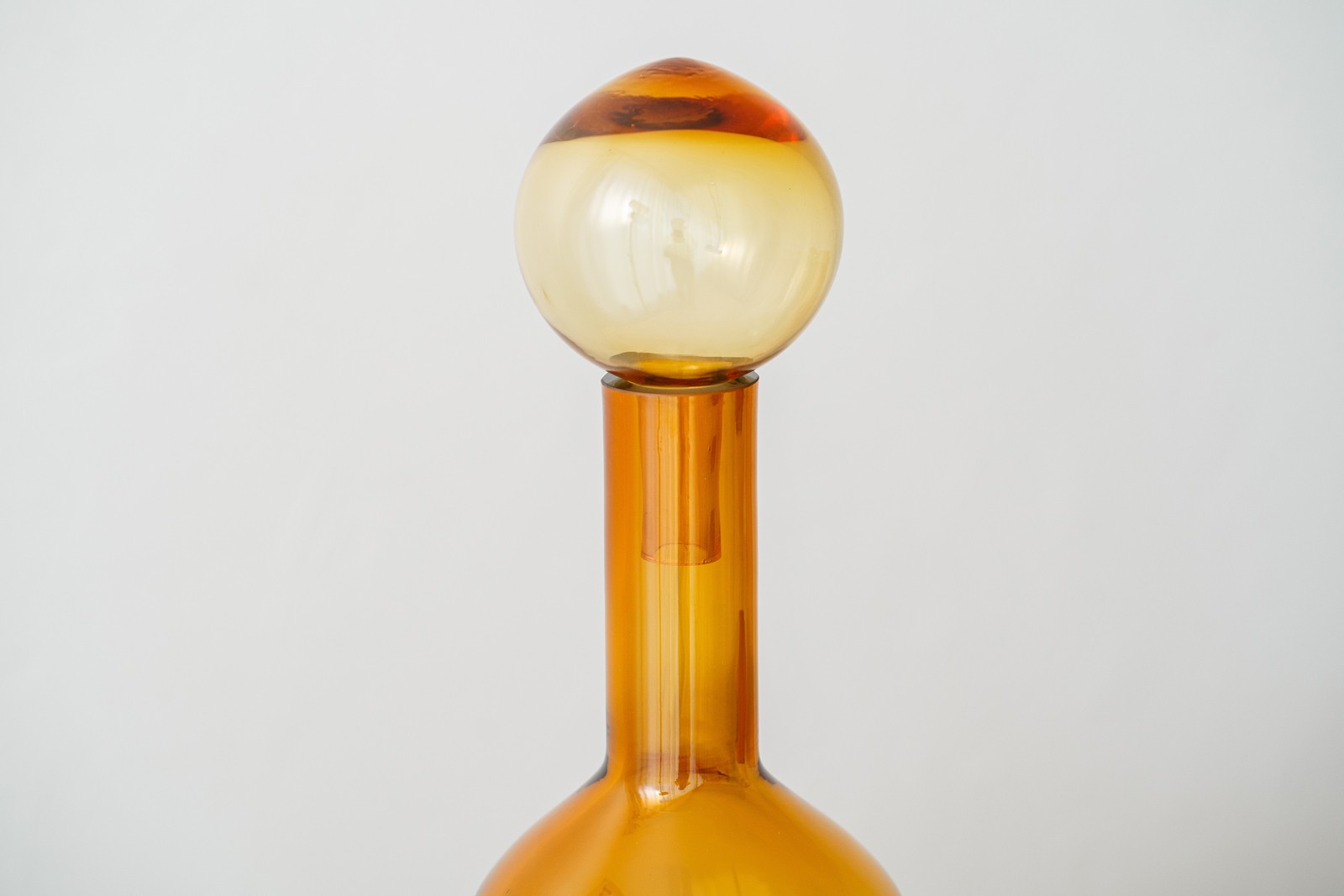 BOTELLA DECORATIVA EN VIDRIO NEME. COLOR ÁMBAR. TAMAÑO GRANDE. EN ESTA BOTELLA DECORATIVA SE HA JUGADO CON EL COLOR Y LA TRANSPARENCIA DEL VIDRIO QUE LE DA FORMA. EL TONO ÁMBAR INTENSO EN LA BASE DE LA BOTELLA SE VA DIFUMINANDO A MEDIDA QUE ASCIENDE EN LA PIEZA HASTA VOLVERSE CASI TRANSPARENTE EN LA PARTE SUPERIOR PARA VOLVER AL ÁMBAR INTENSO EN EL TAPÓN. EL RESULTADO ES UN ELEMENTO SUTIL PENSADO PARA APORTAR UN PUNTO DE COLOR SIN ESTRIDENCIAS.