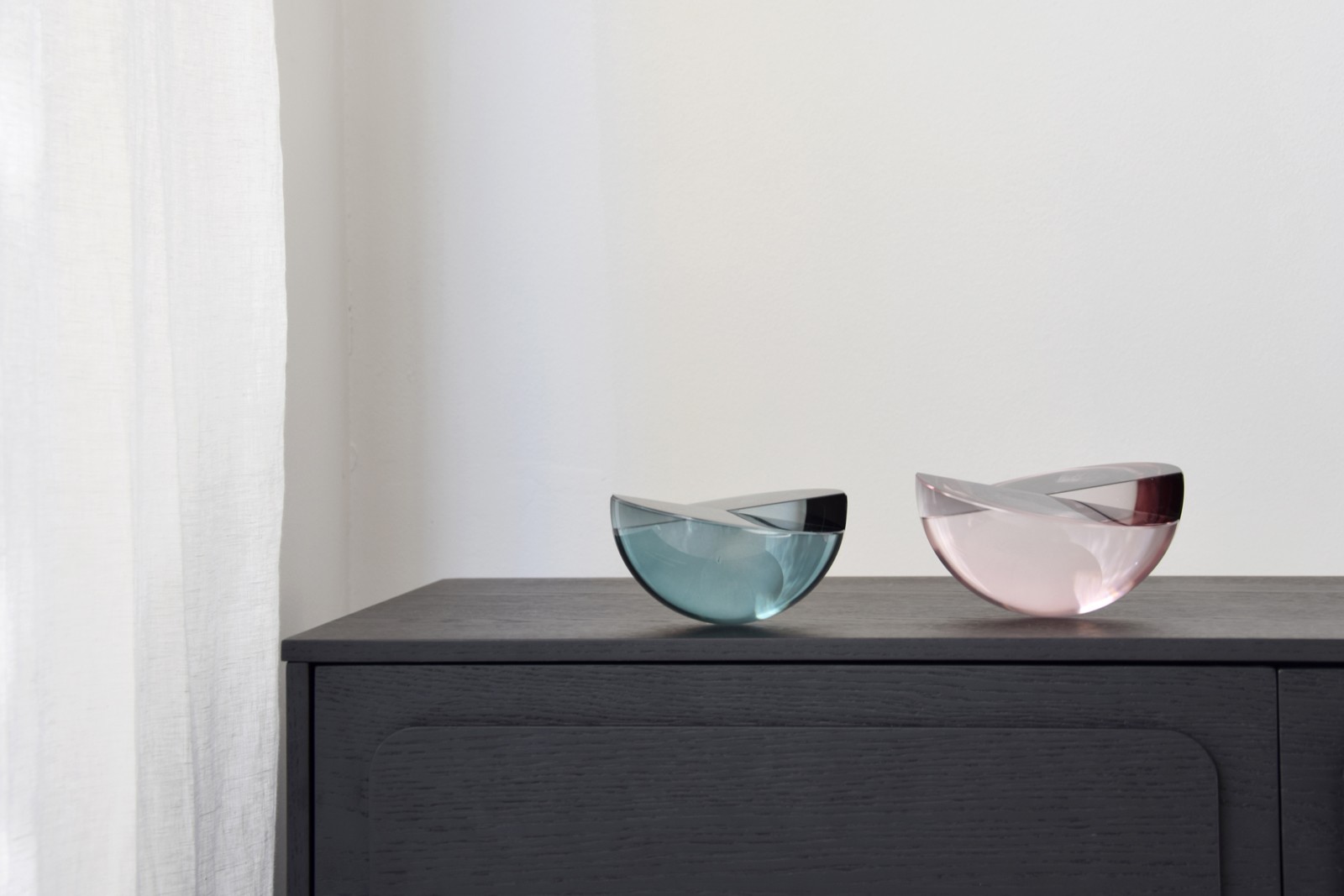 PIEZA DECORATIVA EN FORMA DE SEMIESFERA CORTADA EN DOS NIVELS REALIZADA EN CRISTAL COLOR ROJO BURDEOS.PIEZAS EN CRISTAL PULIDO COLOREADO.