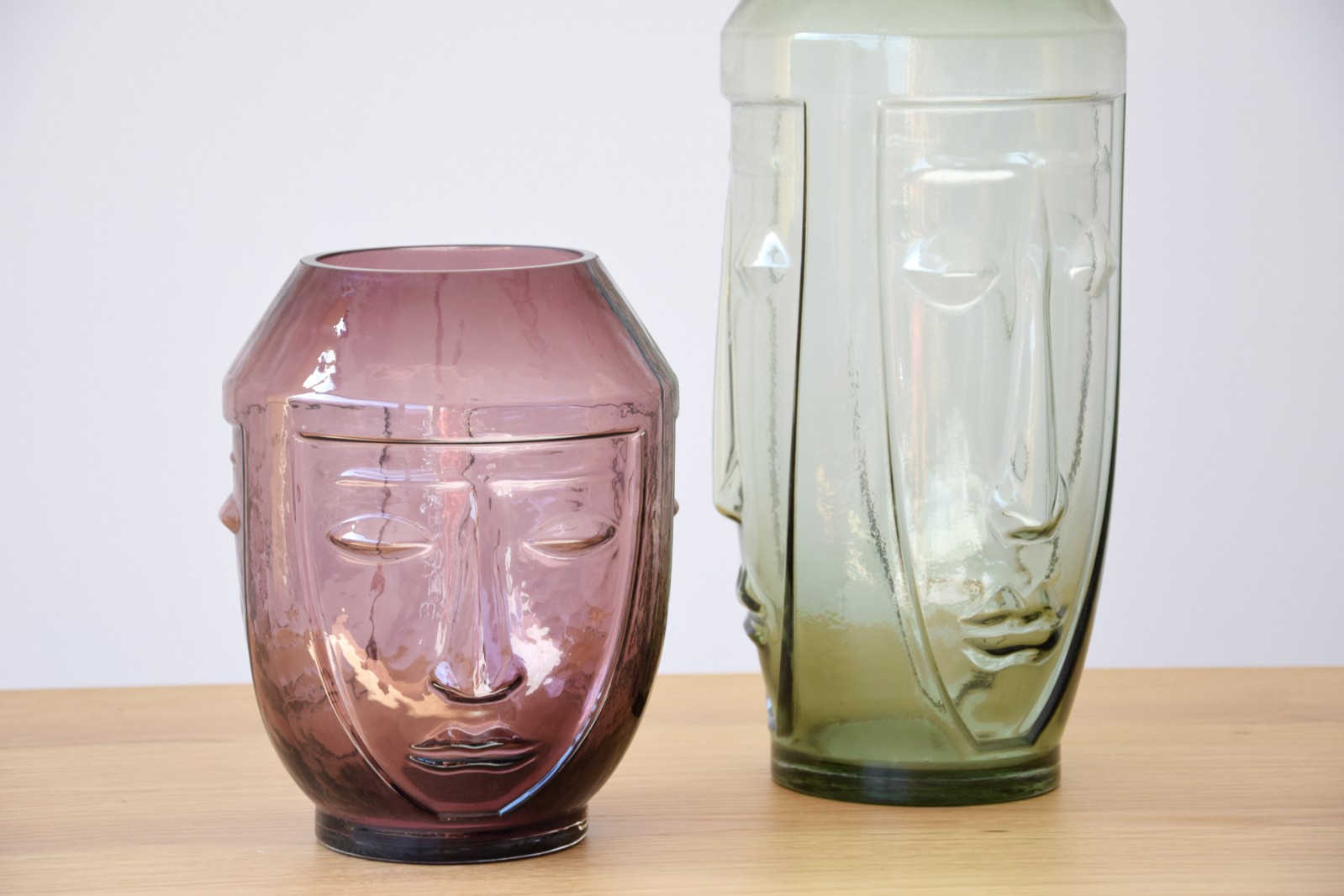 DIVERTIDO CONJUNTO DE JARRONES REALIZADO EN VIDRIO CON DIBUJO DE TRES ROSTROS EN RELIEVE EN COLOR VERDE Y ROSA. LAS BURBUJAS Y PEQUEÑAS IMPERFECCIONES QUE PUEDAN PRESENTAR SON EL RESULTADO DEL PROCESO ARTESANAL DE PRODUCCIÓN. TAMAÑO GRANDE EN COLOR VERDE 17x17x34.5CM Y TAMAÑO PEQUEÑO EN COLOR ROSA 17x17x22.5CM--