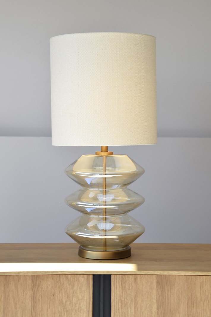 LÁMPARA REALIZADA EN VIDRIO EN UN BONITO TONO ÁMBAR TRANSPARENTE CON BASE EN METAL ACABADO ORO ENVEJECIDO MATE. LA PANTALLA CILÍNDRICA ESTÁ REALIZADA EN LINO DE TEXTURA GRUESA EN TONO CREMA. MEDIDAS BASE:30xH37CM - MEDIDAS DE LA PANTALLA: D38xH38 CM - CASQUILLO E-27