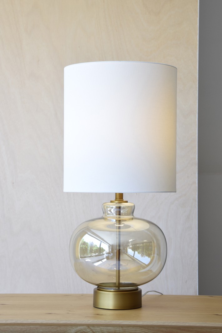 LÁMPARA DE MESA ORBE. REALIZADA EN VIDRIO EN UN BONITO TONO ÁMBAR TRANSPARENTE CON BASE EN METAL ACABADO ORO ENVEJECIDO MATE.INCLUYE PANTALLA CILÍNDRICA REALIZADA EN LINO COLOR BLANCO. MEDIDA BASE: D31xH44CM.MEDIDAS DE LA PANTALLA: D35xH38CM