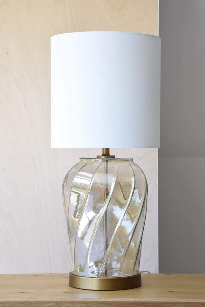 LÁMPARA DE MESA TWIST. REALIZADA EN VIDRIO EN UN BONITO TONO ÁMBAR TRANSPARENTE CON BASE EN METAL ACABADO ORO ENVEJECIDO MATE.INCLUYE PANTALLA CILÍNDRICA REALIZADA EN LINO COLOR BLANCO. MEDIDA DE LA BASE:D31xH54CM.MEDIDAS DE LA PANTALLA: D38xH38CM