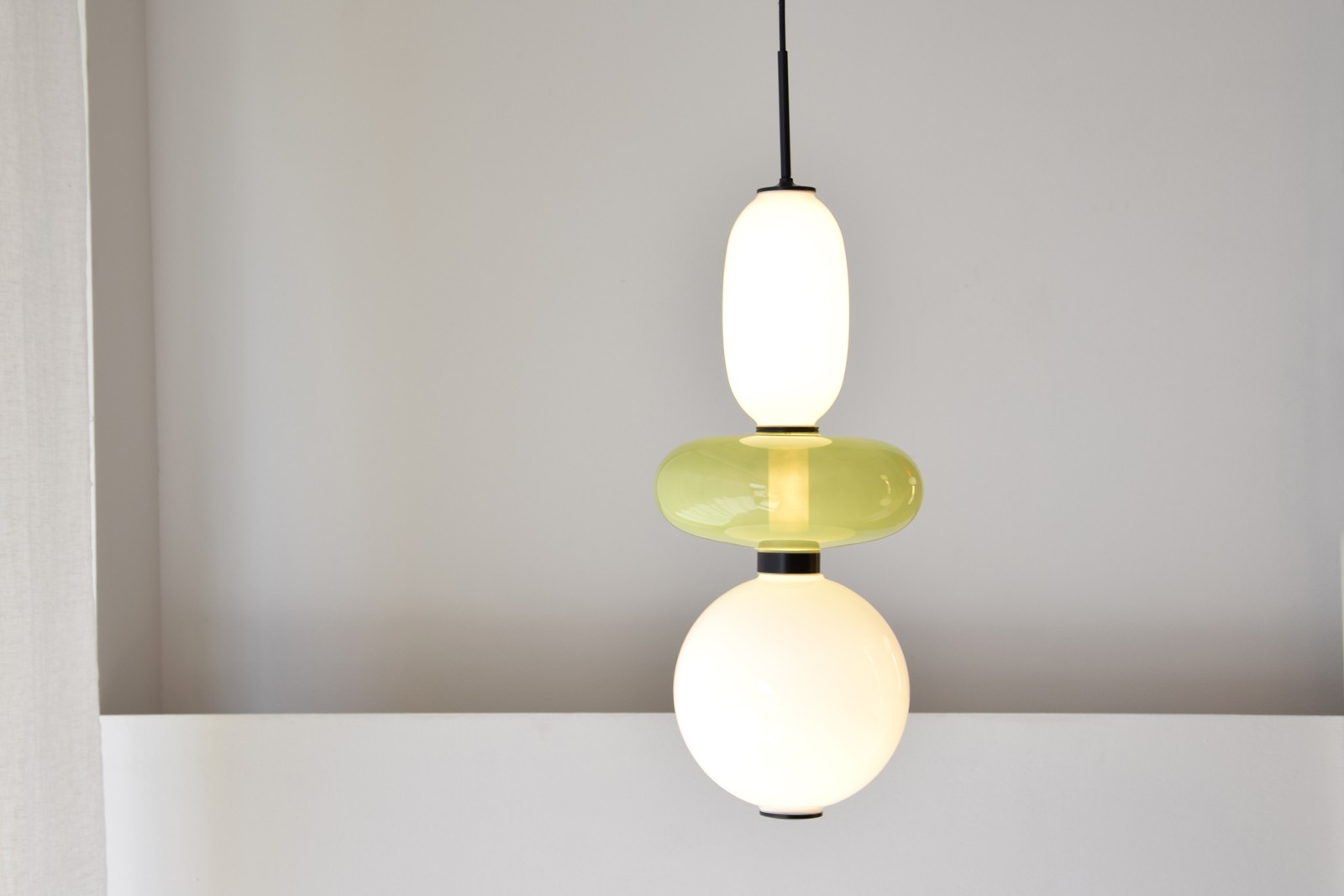 LÁMPARA DE TECHO DE LA COLECCIÓN RACIMO FORMADA POR 3 FORMAS DISTINTAS DE PIEZAS DE VIDRIO EN VARIOS COLORES SIENDO LA DE MAYOR TAMAÑO LA FORMA ESFÉRICA BLANCA INFERIOR. ESFERA Y ÓVALOS EN VERDE Y BLANCO SE COMBINAN Y UNEN A TRAVÉS DE ANILLOS METÁLICOS EN NEGRO DE DIFERENTE ALTURA CREANDO UN RACIMO DE LUZ. UNA COLECCIÓN PENSADA PAR COMBINAR FORMAS Y COLORES Y LLENAR DE LUZ UNA ESTANCIA. TAMAÑO DE LÁMPARA 20x20x53CM. CAMBLE TEXTIL NEGRO 120CM. INLCUYE LED 16W 3000ºK. LIMPIAR CON PAÑO SECO.