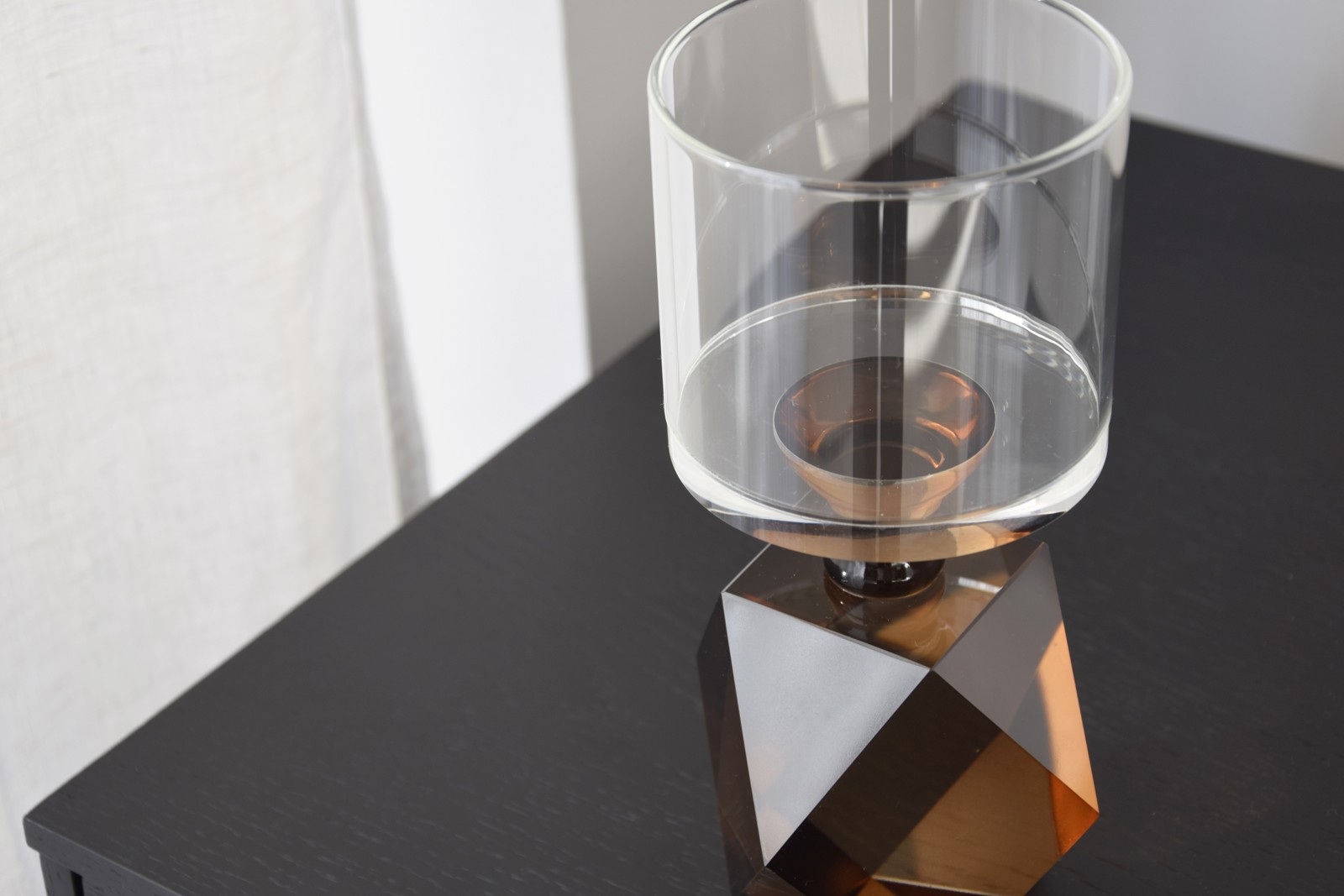 CANDELABRO DE CRISTAL CON BASE EN FORMA POLIÉDRICA EN COLOR ÁMBAR Y PARTE SUPERIOR EN CRISTAL TRANSPARENTE. OBJETO DE DECORACIÓN TRANQUILO PERFECTO EN TODOS LOS AMBIENTES. PIEZA EN CRISTAL PULIDO COLOREADO.