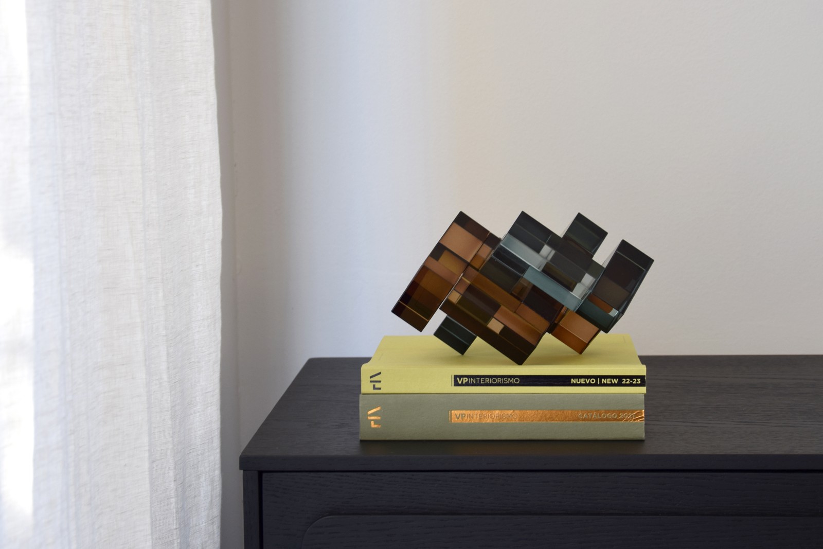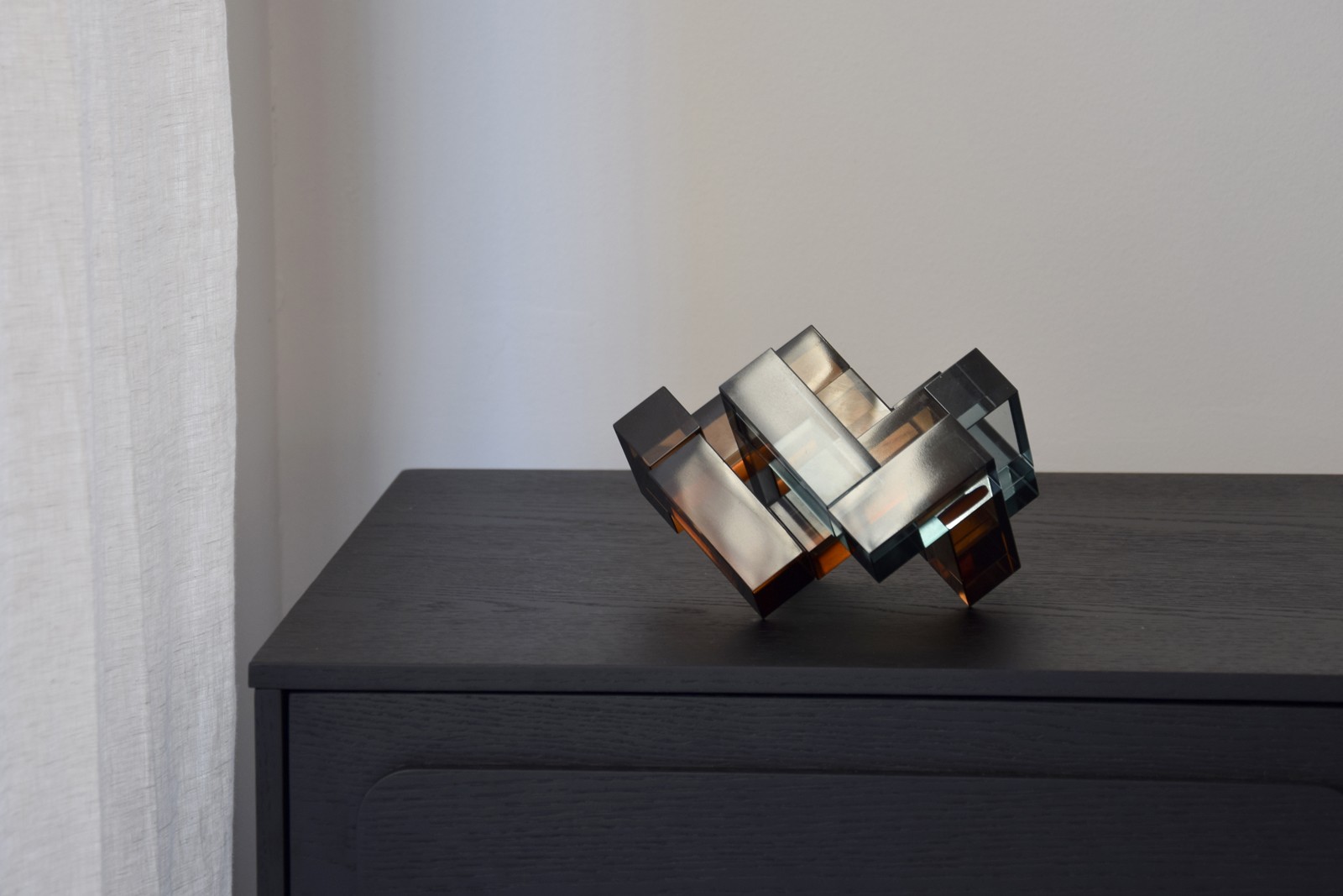 PIEZA DECORATIVA REALIZADA EN CRISTAL EN DOS COLORES: MARRÓN ÁMBAR Y AZUL. DE MANERA ENTRELAZADA CADA UNA DE LAS FIGURAS EN SU COLOR SE MEZCLA CON LA OTRA FORMANDO UN NUDO. SENCILLA ROTUNDA Y DE COLORES SUAVES ES UNA PIEZA QUE DIALOGA CON CUALQUIER ESTILO DE DECORACIÓN.PIEZA EN CRISTAL PULIDO COLOREADO.