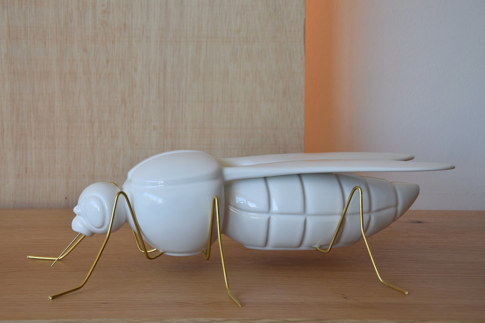 FUGURA DE MOSQUITO REALIZADA EN CERÁMICA ACABADO BLANCO BRILLO. PATAS METAL DORADO ENVEJECIDO.